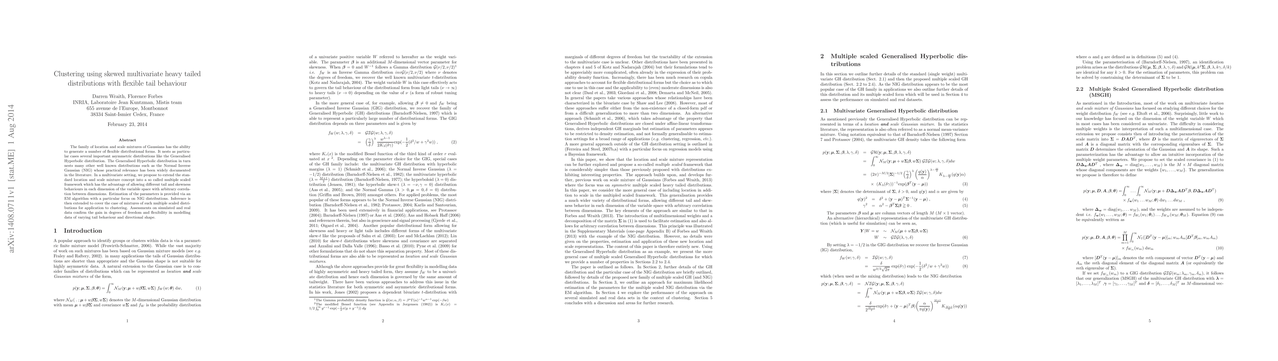 The family of location and scale mixtures of Gaussians has the ability to generate a number of flexible distributional forms. It nests as particular cases several important asymmetric distributions like the Generalised Hyperbolic distribution. The Generalised Hyperbolic distribution in turn nests many other well known distributions such as the Normal Inverse Gaussian (NIG) whose practical relevance has been widely documented in the literature. In a multivariate setting, we propose to extend the standard location and scale mixture concept into a so called multiple scaled framework which has the advantage of allowing different tail and skewness behaviours in each dimension of the variable space with arbitrary correlation between dimensions. Estimation of the parameters is provided via an EM algorithm with a particular focus on NIG distributions. Inference is then extended to cover the case of mixtures of such multiple scaled distributions for application to clustering. Assessments on simulated and real data confirm the gain in degrees of freedom and flexibility in modelling data of varying tail behaviour and directional shape.