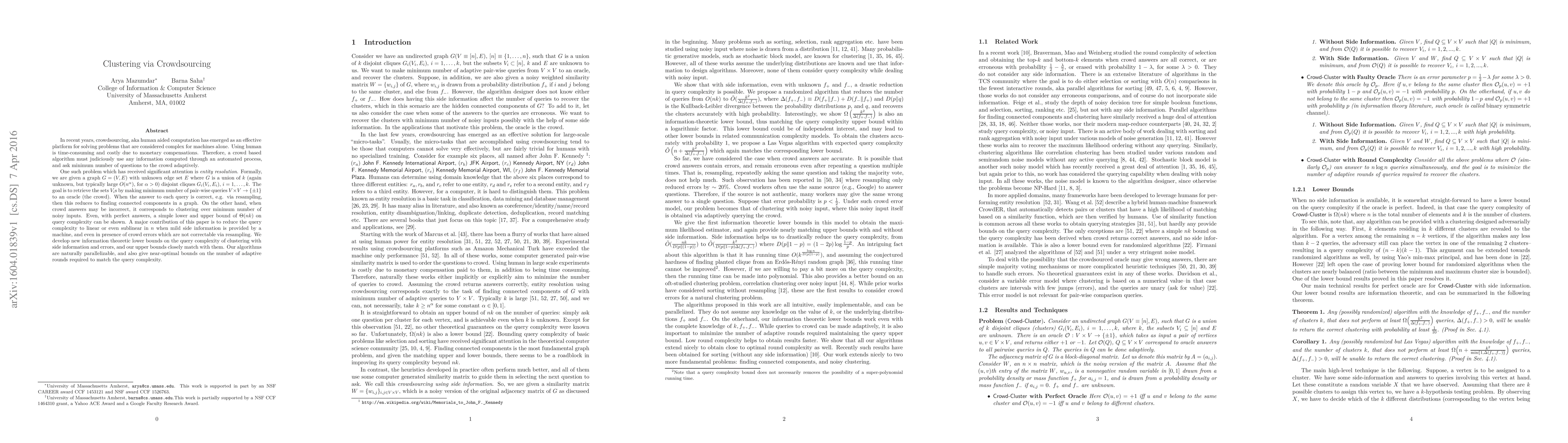 In recent years, crowdsourcing, aka human aided computation has emerged as an effective platform for solving problems that are considered complex for machines alone. Using human is time-consuming and costly due to monetary compensations. Therefore, a crowd based algorithm must judiciously use any information computed through an automated process, and ask minimum number of questions to the crowd adaptively. One such problem which has received significant attention is {\em entity resolution}. Formally, we are given a graph $G=(V,E)$ with unknown edge set $E$ where $G$ is a union of $k$ (again unknown, but typically large $O(n^\alpha)$, for $\alpha>0$) disjoint cliques $G_i(V_i, E_i)$, $i =1, \dots, k$. The goal is to retrieve the sets $V_i$s by making minimum number of pair-wise queries $V \times V\to\{\pm1\}$ to an oracle (the crowd). When the answer to each query is correct, e.g. via resampling, then this reduces to finding connected components in a graph. On the other hand, when crowd answers may be incorrect, it corresponds to clustering over minimum number of noisy inputs. Even, with perfect answers, a simple lower and upper bound of $\Theta(nk)$ on query complexity can be shown. A major contribution of this paper is to reduce the query complexity to linear or even sublinear in $n$ when mild side information is provided by a machine, and even in presence of crowd errors which are not correctable via resampling. We develop new information theoretic lower bounds on the query complexity of clustering with side information and errors, and our upper bounds closely match with them. Our algorithms are naturally parallelizable, and also give near-optimal bounds on the number of adaptive rounds required to match the query complexity.
