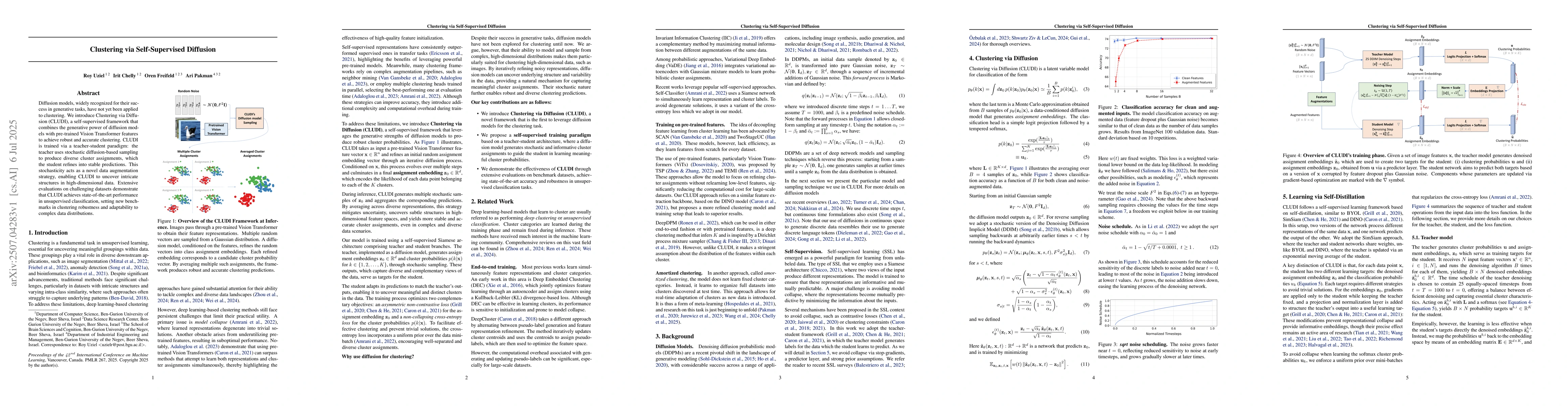 Diffusion models, widely recognized for their success in generative tasks, have not yet been applied to clustering. We introduce Clustering via Diffusion (CLUDI), a self-supervised framework that combines the generative power of diffusion models with pre-trained Vision Transformer features to achieve robust and accurate clustering. CLUDI is trained via a teacher-student paradigm: the teacher uses stochastic diffusion-based sampling to produce diverse cluster assignments, which the student refines into stable predictions. This stochasticity acts as a novel data augmentation strategy, enabling CLUDI to uncover intricate structures in high-dimensional data. Extensive evaluations on challenging datasets demonstrate that CLUDI achieves state-of-the-art performance in unsupervised classification, setting new benchmarks in clustering robustness and adaptability to complex data distributions.