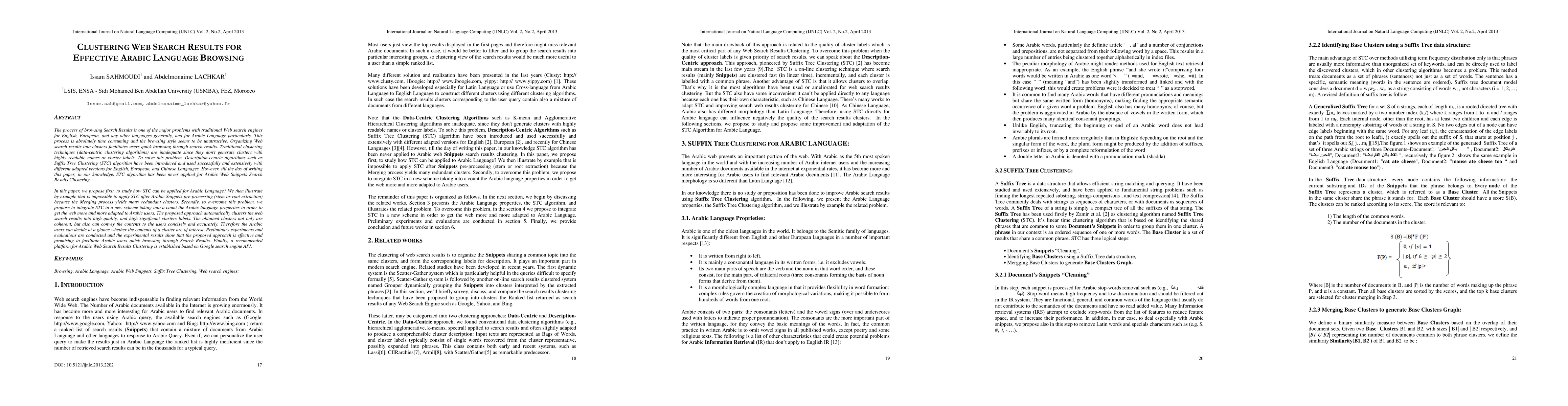 This paper proposes a novel approach to cluster Arabic web search results using the Suffix Tree Clustering (STC) algorithm, addressing the inadequacy of traditional clustering methods for Arabic language. The study finds that direct application of STC post-processing is ineffective due to redundant clusters, and thus introduces a new scheme integrating STC with Arabic language properties to generate coherent, readable, and meaningful cluster labels for effective Arabic browsing.