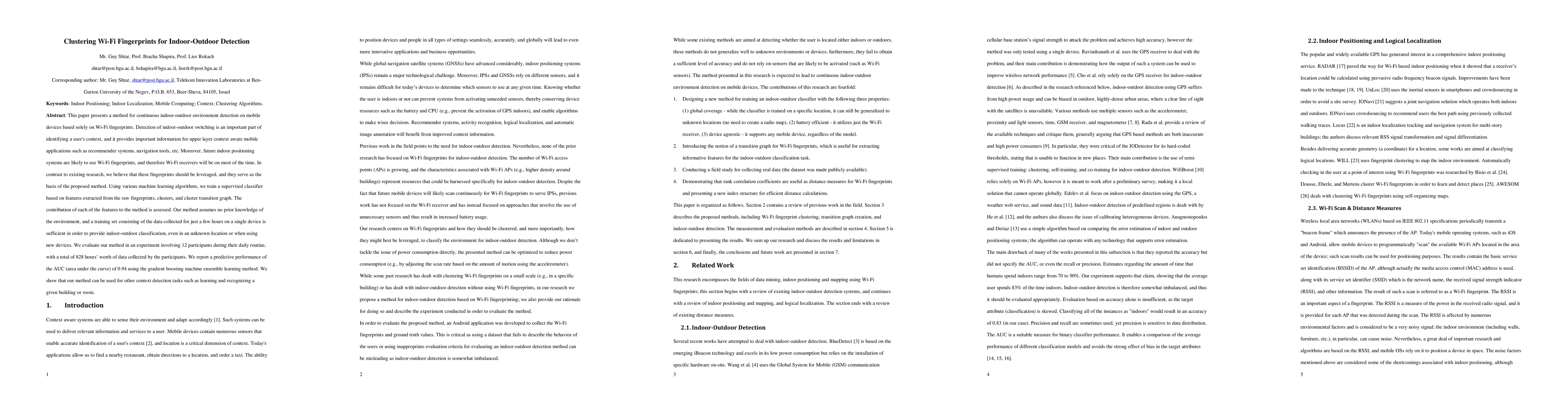 This paper proposes a machine learning-based method for continuous indoor-outdoor detection on mobile devices using Wi-Fi fingerprints, achieving an AUC of 0.94. The method requires minimal training data and can classify environments without prior knowledge, demonstrating potential for broader context-aware applications.