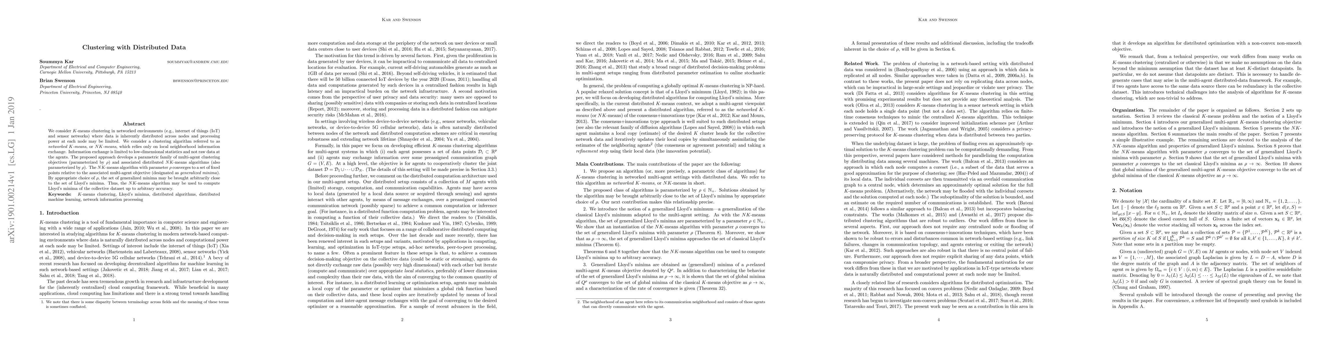 We consider $K$-means clustering in networked environments (e.g., internet of things (IoT) and sensor networks) where data is inherently distributed across nodes and processing power at each node may be limited. We consider a clustering algorithm referred to as networked $K$-means, or $NK$-means, which relies only on local neighborhood information exchange. Information exchange is limited to low-dimensional statistics and not raw data at the agents. The proposed approach develops a parametric family of multi-agent clustering objectives (parameterized by $\rho$) and associated distributed $NK$-means algorithms (also parameterized by $\rho$). The $NK$-means algorithm with parameter $\rho$ converges to a set of fixed points relative to the associated multi-agent objective (designated as `generalized minima'). By appropriate choice of $\rho$, the set of generalized minima may be brought arbitrarily close to the set of Lloyd's minima. Thus, the $NK$-means algorithm may be used to compute Lloyd's minima of the collective dataset up to arbitrary accuracy.