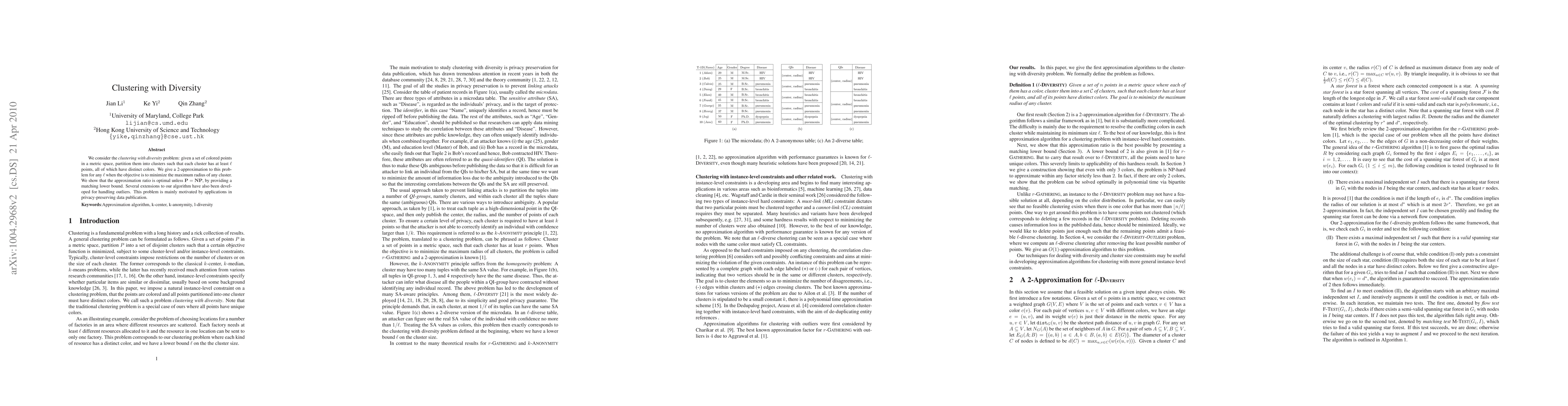 We consider the {\em clustering with diversity} problem: given a set of colored points in a metric space, partition them into clusters such that each cluster has at least $\ell$ points, all of which have distinct colors. We give a 2-approximation to this problem for any $\ell$ when the objective is to minimize the maximum radius of any cluster. We show that the approximation ratio is optimal unless $\mathbf{P=NP}$, by providing a matching lower bound. Several extensions to our algorithm have also been developed for handling outliers. This problem is mainly motivated by applications in privacy-preserving data publication.