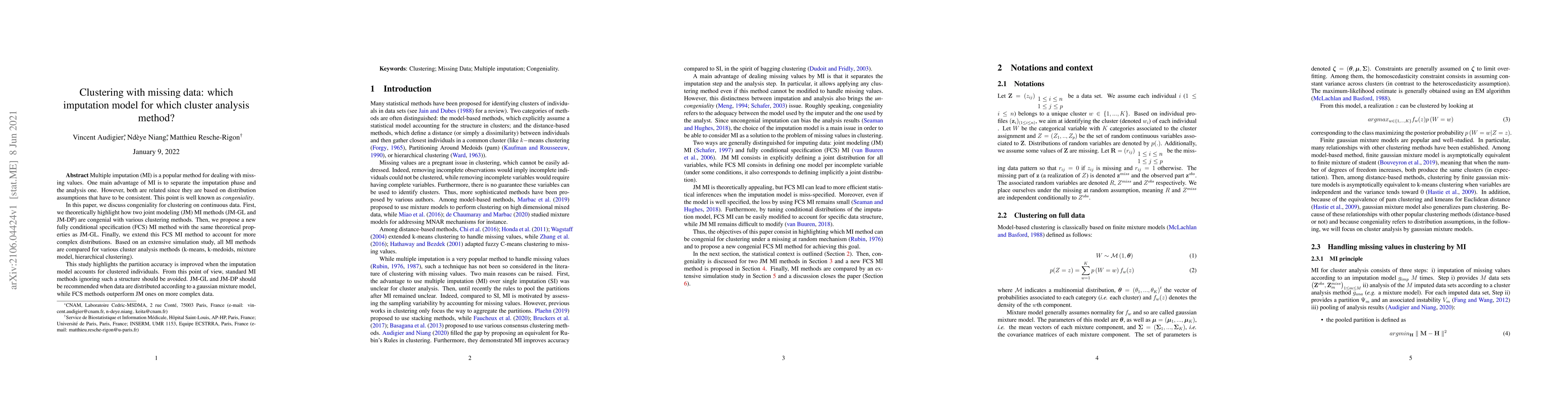 This paper explores the relationship between imputation models and clustering methods for handling missing data, demonstrating that joint modeling imputation methods (JM-GL and JM-DP) are congenial with Gaussian mixture model clustering, while fully conditional specification (FCS) methods perform better for more complex distributions. Simulation results suggest improved partition accuracy when imputation models account for clustered data.