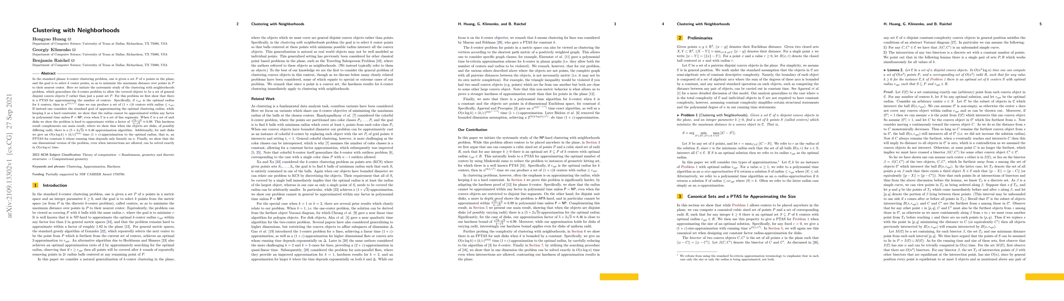 In the standard planar $k$-center clustering problem, one is given a set $P$ of $n$ points in the plane, and the goal is to select $k$ center points, so as to minimize the maximum distance over points in $P$ to their nearest center. Here we initiate the systematic study of the clustering with neighborhoods problem, which generalizes the $k$-center problem to allow the covered objects to be a set of general disjoint convex objects $\mathscr{C}$ rather than just a point set $P$. For this problem we first show that there is a PTAS for approximating the number of centers. Specifically, if $r_{opt}$ is the optimal radius for $k$ centers, then in $n^{O(1/\varepsilon^2)}$ time we can produce a set of $(1+\varepsilon)k$ centers with radius $\leq r_{opt}$. If instead one considers the standard goal of approximating the optimal clustering radius, while keeping $k$ as a hard constraint, we show that the radius cannot be approximated within any factor in polynomial time unless $\mathsf{P=NP}$, even when $\mathscr{C}$ is a set of line segments. When $\mathscr{C}$ is a set of unit disks we show the problem is hard to approximate within a factor of $\frac{\sqrt{13}-\sqrt{3}}{2-\sqrt{3}}\approx 6.99$. This hardness result complements our main result, where we show that when the objects are disks, of possibly differing radii, there is a $(5+2\sqrt{3})\approx 8.46$ approximation algorithm. Additionally, for unit disks we give an $O(n\log k)+(k/\varepsilon)^{O(k)}$ time $(1+\varepsilon)$-approximation to the optimal radius, that is, an FPTAS for constant $k$ whose running time depends only linearly on $n$. Finally, we show that the one dimensional version of the problem, even when intersections are allowed, can be solved exactly in $O(n\log n)$ time.