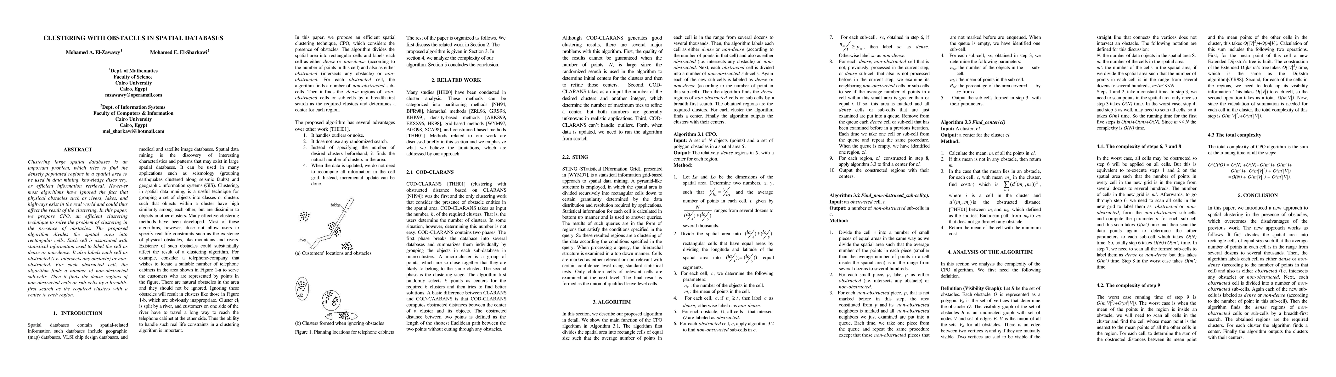 A new clustering technique called CPO is proposed to handle obstacles in spatial databases, dividing areas into cells based on density and obstruction status, and identifying clusters using a breadth-first search algorithm.
