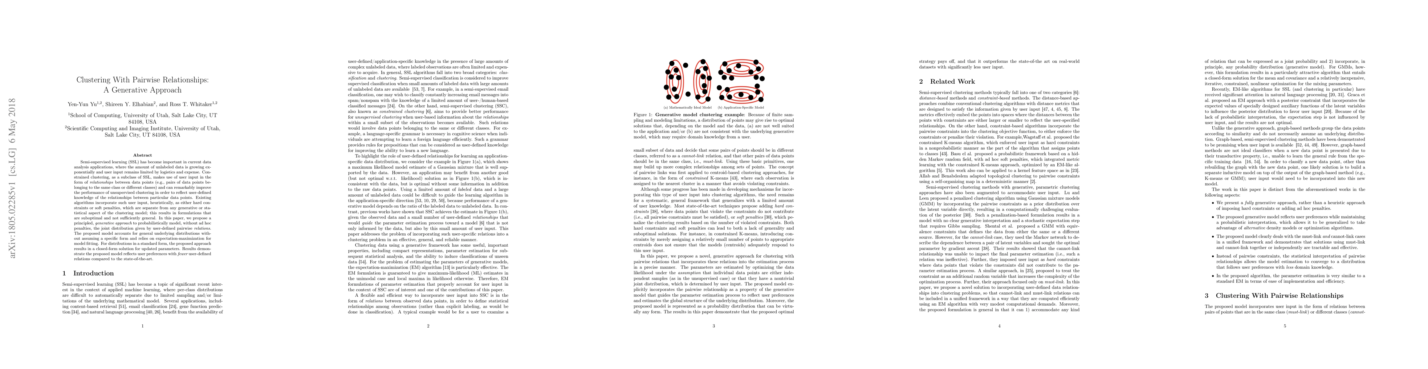 This paper introduces a generative approach for semi-supervised clustering based on pairwise relationships, aiming to improve clustering performance by incorporating user-defined knowledge. The proposed model probabilistically models the joint distribution of pairwise relations without ad hoc penalties, using expectation-maximization for parameter fitting and yielding closed-form solutions for standard distributions.