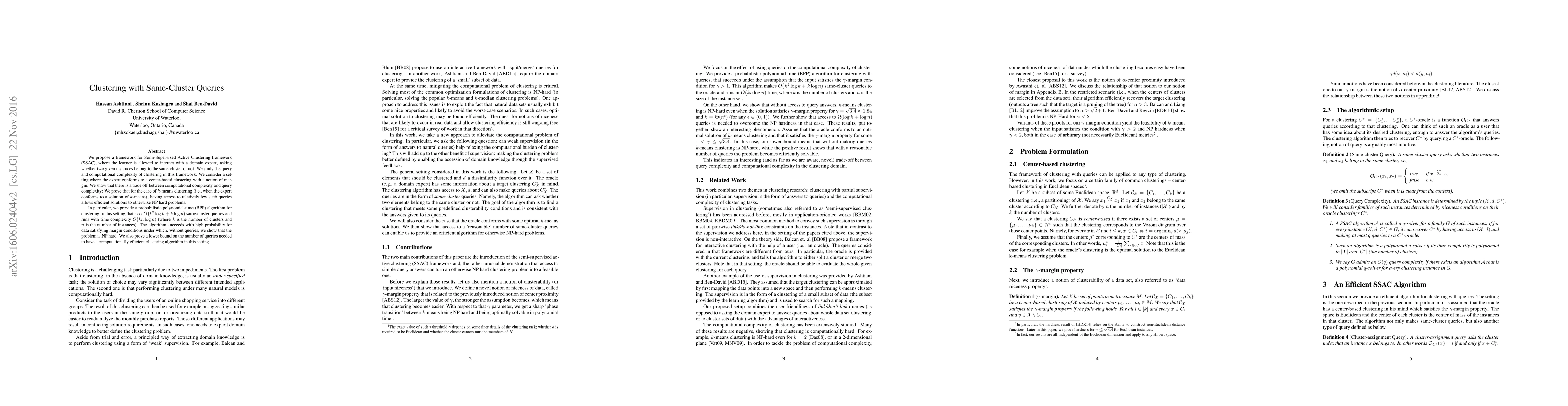 This paper proposes a Semi-Supervised Active Clustering (SSAC) framework where a learner can query a domain expert to determine if two instances belong to the same cluster. It presents a probabilistic algorithm that efficiently solves $k$-means clustering with a polynomial runtime, leveraging a limited number of same-cluster queries.