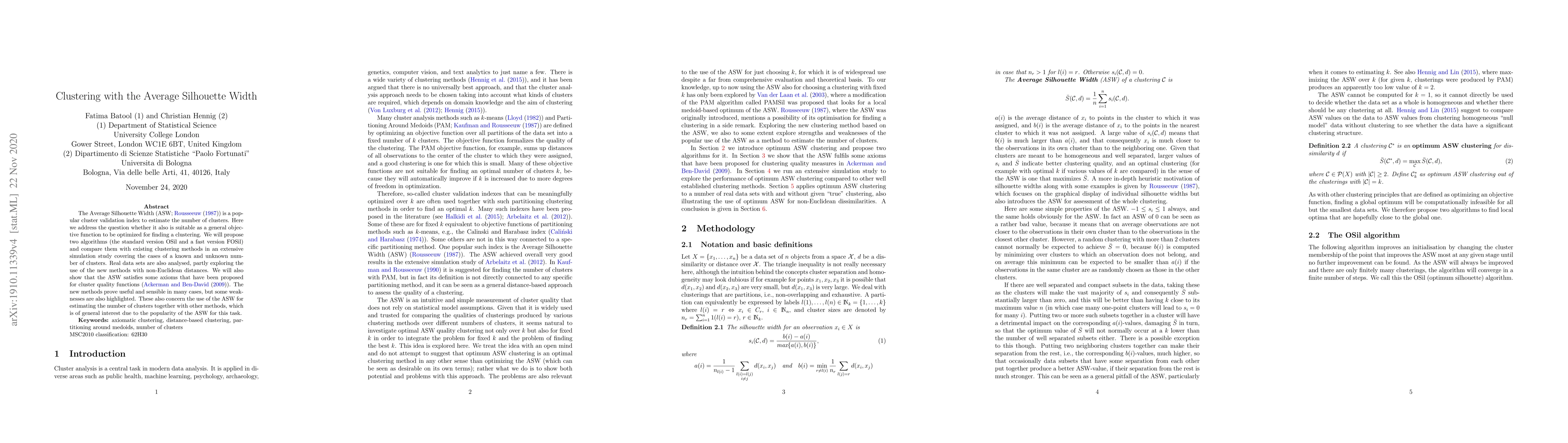 This paper proposes two algorithms, OSil and FOSil, to optimize the Average Silhouette Width (ASW) for clustering, comparing them to existing methods in simulations and real datasets. It finds the ASW satisfies certain cluster quality axioms, though it also highlights some weaknesses in its use for estimating cluster numbers.