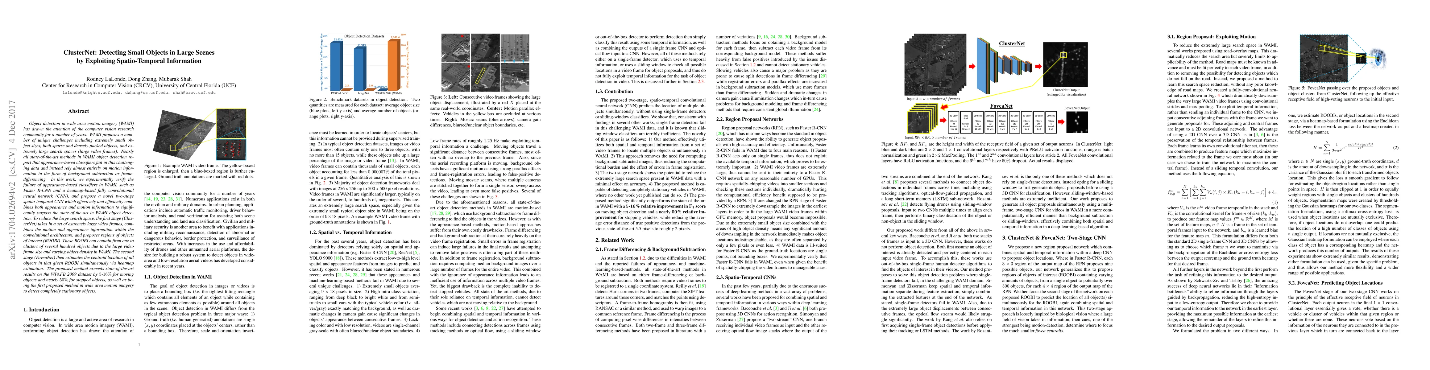 Object detection in wide area motion imagery (WAMI) has drawn the attention of the computer vision research community for a number of years. WAMI proposes a number of unique challenges including extremely small object sizes, both sparse and densely-packed objects, and extremely large search spaces (large video frames). Nearly all state-of-the-art methods in WAMI object detection report that appearance-based classifiers fail in this challenging data and instead rely almost entirely on motion information in the form of background subtraction or frame-differencing. In this work, we experimentally verify the failure of appearance-based classifiers in WAMI, such as Faster R-CNN and a heatmap-based fully convolutional neural network (CNN), and propose a novel two-stage spatio-temporal CNN which effectively and efficiently combines both appearance and motion information to significantly surpass the state-of-the-art in WAMI object detection. To reduce the large search space, the first stage (ClusterNet) takes in a set of extremely large video frames, combines the motion and appearance information within the convolutional architecture, and proposes regions of objects of interest (ROOBI). These ROOBI can contain from one to clusters of several hundred objects due to the large video frame size and varying object density in WAMI. The second stage (FoveaNet) then estimates the centroid location of all objects in that given ROOBI simultaneously via heatmap estimation. The proposed method exceeds state-of-the-art results on the WPAFB 2009 dataset by 5-16% for moving objects and nearly 50% for stopped objects, as well as being the first proposed method in wide area motion imagery to detect completely stationary objects.