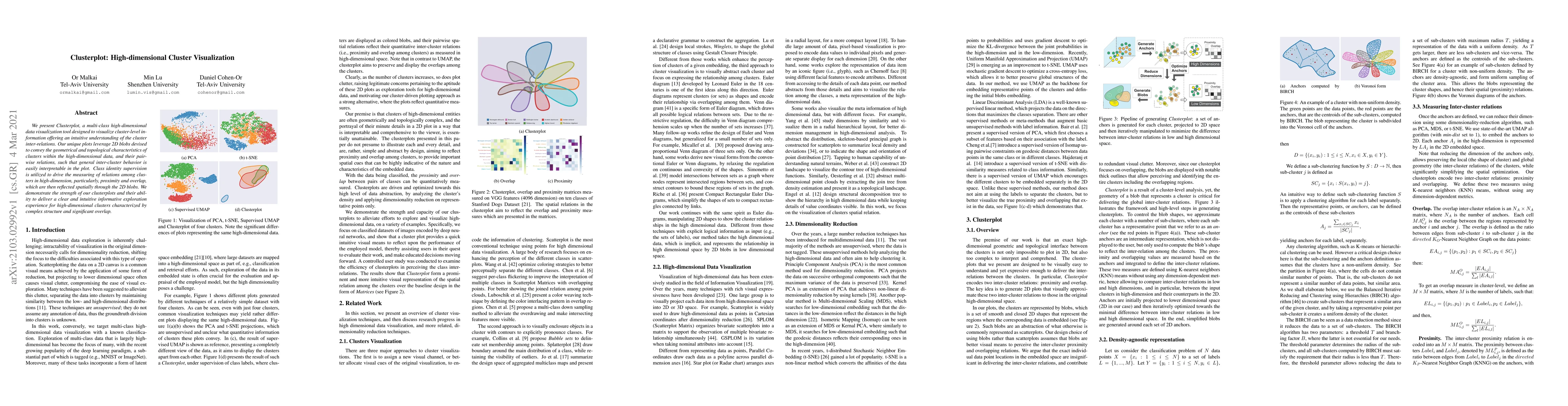Clusterplot offers a new visualization tool to explore high-dimensional clusters, using 2D blobs to represent cluster relations and facilitating an intuitive understanding of cluster inter-relations.