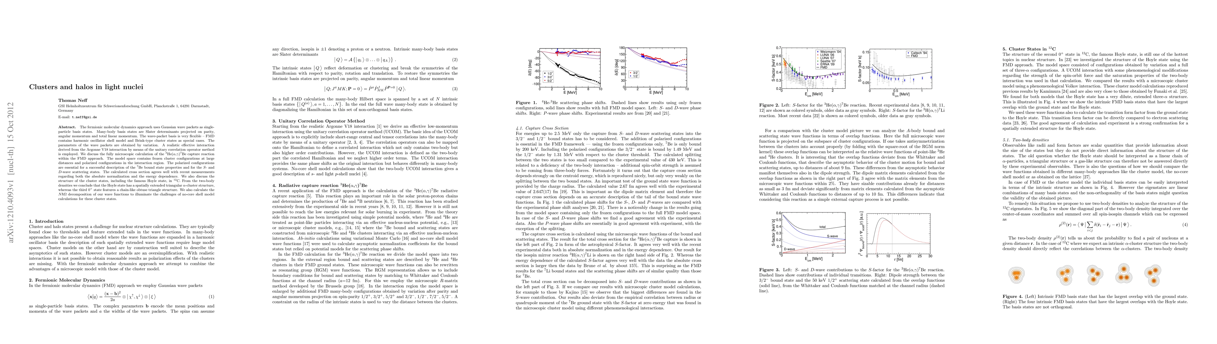 The fermionic molecular dynamics approach uses Gaussian wave packets as single-particle basis states. Many-body basis states are Slater determinants projected on parity, angular momentum and total linear momentum. The wave-packet basis is very flexible - FMD contains harmonic oscillator shell model and Brink-type cluster states as special cases. The parameters of the wave packets are obtained by variation. A realistic effective interaction derived from the Argonne V18 interaction by means of the unitary correlation operator method is employed. We discuss the fully microscopic calculation of the 3He(alpha,gamma)7Be capture reaction within the FMD approach. The model space contains frozen cluster configurations at large distances and polarized configurations in the interaction region. The polarized configurations are essential for a successful description of the 7Be bound state properties and for the S- and D-wave scattering states. The calculated cross section agrees well with recent measurements regarding both the absolute normalization and the energy dependence. We also discuss the structure of the cluster states, including the famous Hoyle state, in 12C. From the two-body densities we conclude that the Hoyle state has a spatially extended triangular alpha-cluster structure, whereas the third 0+ state features a chain-like obtuse triangle structure. We also calculate the N hbar Omega decomposition of our wave functions to illuminate the challenges of no-core shell model calculations for these cluster states.