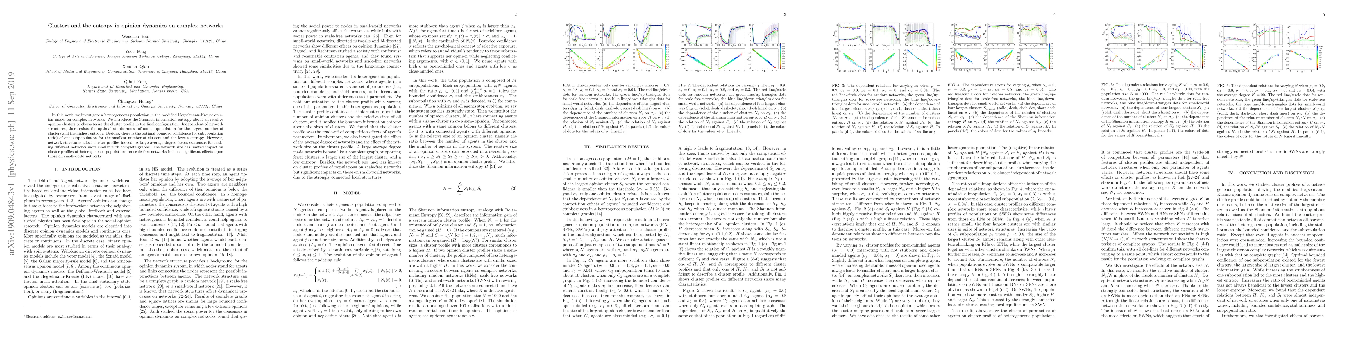 In this work, we investigate a heterogeneous population in the modified Hegselmann-Krause opinion model on complex networks. We introduce the Shannon information entropy about all relative opinion clusters to characterize the cluster profile in the final configuration. Independent of network structures, there exists the optimal stubbornness of one subpopulation for the largest number of clusters and the highest entropy. Besides, there is the optimal bounded confidence (or subpopulation ratio) of one subpopulation for the smallest number of clusters and the lowest entropy. However, network structures affect cluster profiles indeed. A large average degree favors consensus for making different networks more similar with complete graphs. The network size has limited impact on cluster profiles of heterogeneous populations on scale-free networks but has significant effects upon those on small-world networks.