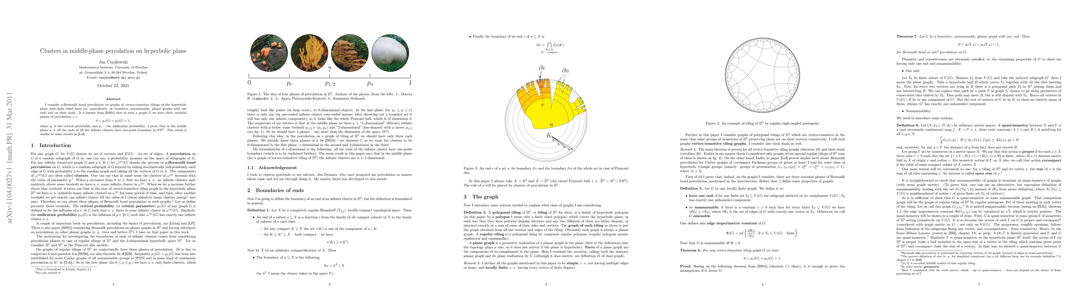 This paper studies p-Bernoulli bond percolation on hyperbolic plane tilings and their duals, demonstrating that in the middle-phase percolation, all infinite clusters have one-point boundary in the hyperbolic boundary, akin to findings by Lalley. The work highlights the distinct percolation phases and the structural properties of clusters in this context.