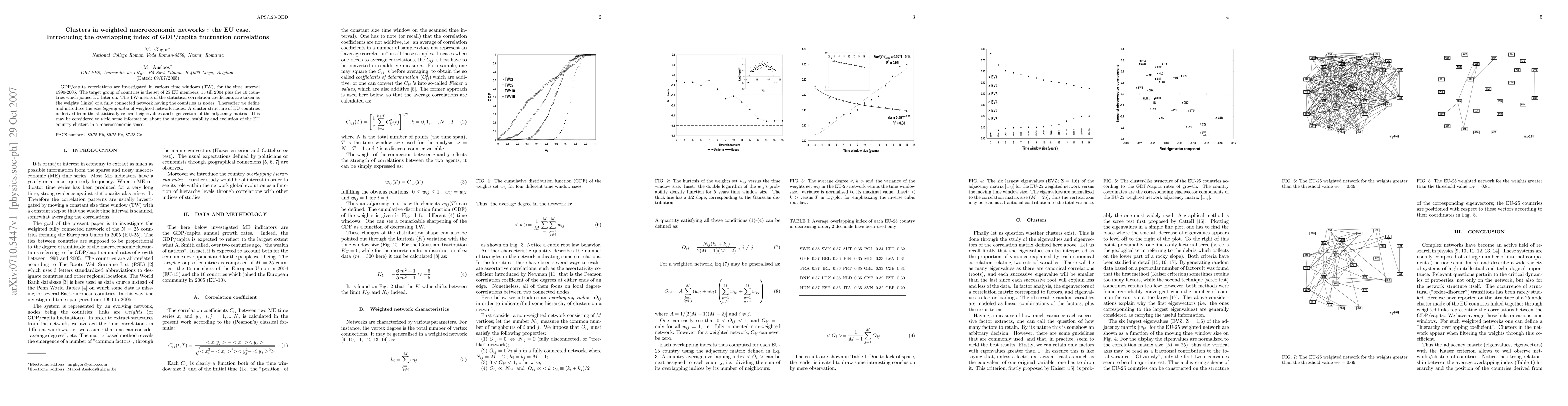 GDP/capita correlations are investigated in various time windows (TW), for the time interval 1990-2005. The target group of countries is the set of 25 EU members, 15 till 2004 plus the 10 countries which joined EU later on. The TW-means of the statistical correlation coefficients are taken as the weights (links) of a fully connected network having the countries as nodes. Thereafter we define and introduce the overlapping index of weighted network nodes. A cluster structure of EU countries is derived from the statistically relevant eigenvalues and eigenvectors of the adjacency matrix. This may be considered to yield some information about the structure, stability and evolution of the EU country clusters in a macroeconomic sense.