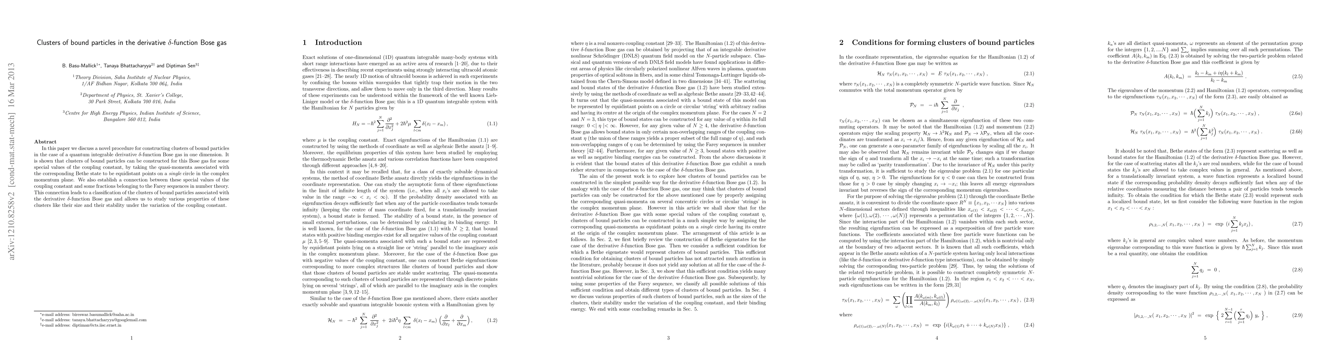 In this paper we discuss a novel procedure for constructing clusters of bound particles in the case of a quantum integrable derivative delta-function Bose gas in one dimension. It is shown that clusters of bound particles can be constructed for this Bose gas for some special values of the coupling constant, by taking the quasi-momenta associated with the corresponding Bethe state to be equidistant points on a single circle in the complex momentum plane. We also establish a connection between these special values of the coupling constant and some fractions belonging to the Farey sequences in number theory. This connection leads to a classification of the clusters of bound particles associated with the derivative delta-function Bose gas and allows us to study various properties of these clusters like their size and their stability under the variation of the coupling constant.