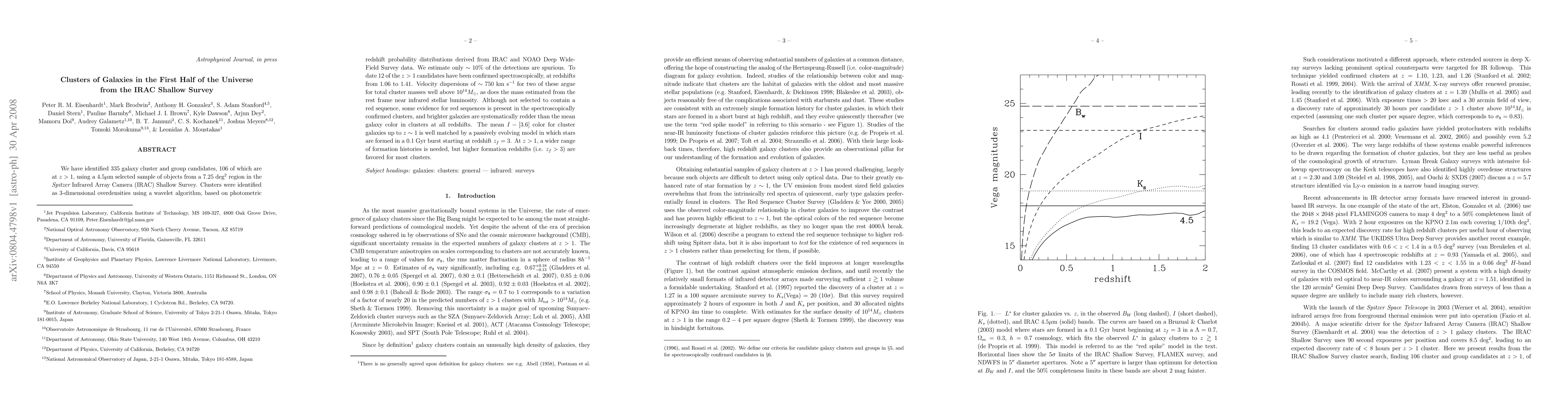 This study identifies 335 galaxy cluster and group candidates, including 106 at z > 1, using a 4.5 µm selected sample from the Spitzer IRAC Shallow Survey. Confirmed clusters show high mass and evidence of red sequences, suggesting star formation histories starting at high redshifts.