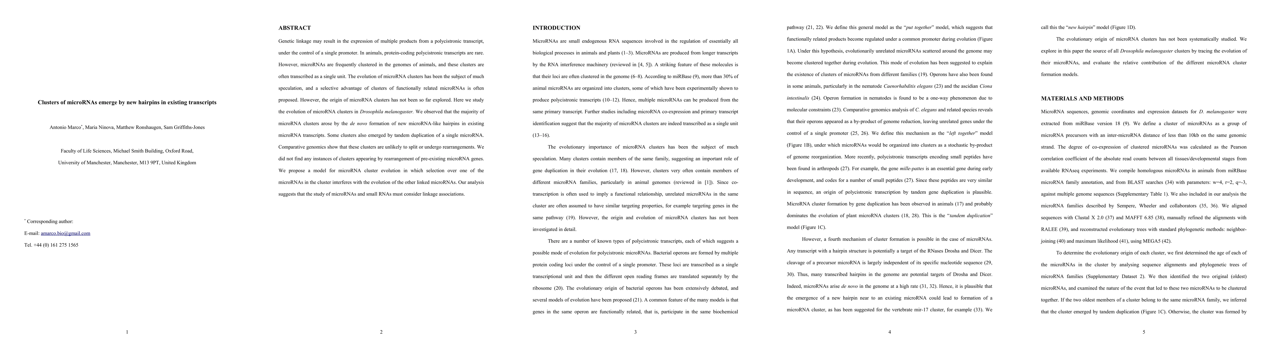 This study explores the evolution of microRNA clusters in Drosophila melanogaster, finding that most clusters emerge through the formation of new microRNA-like hairpins within existing transcripts, rather than by rearrangements of pre-existing microRNA genes. The research proposes a model where selection pressure on one microRNA affects the evolution of linked microRNAs.