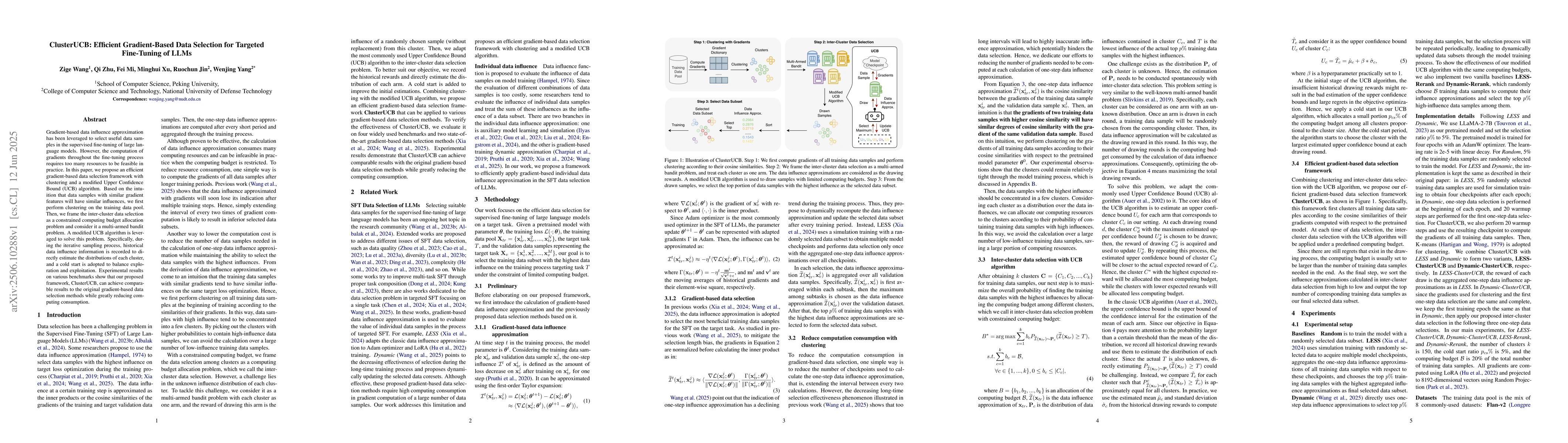 ClusterUCB reduces computing consumption by clustering training data and using a modified UCB algorithm to select useful samples for targeted fine-tuning of large language models.