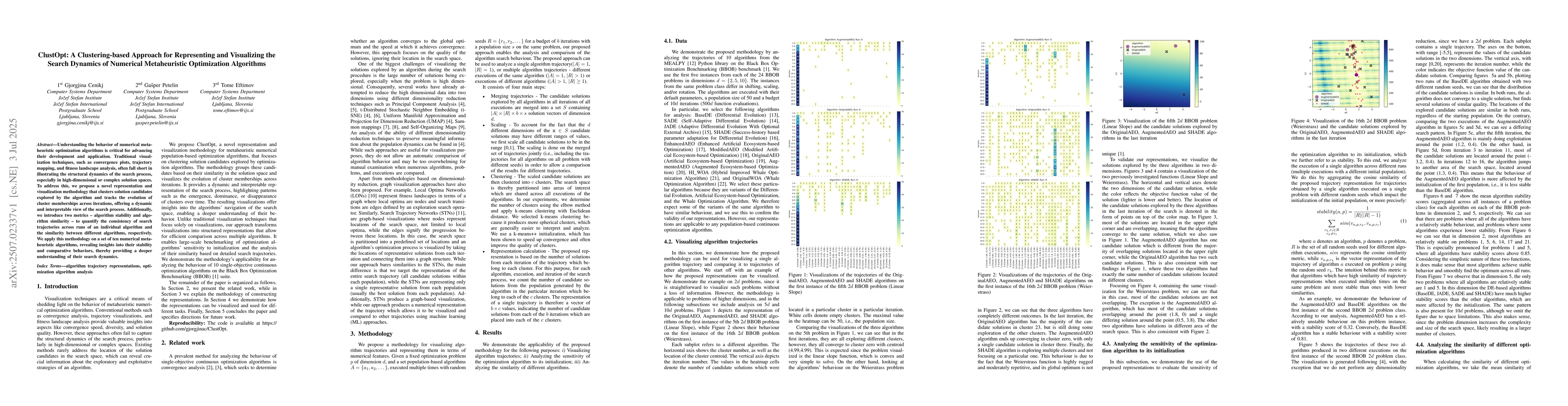 ClustOpt introduces a novel vectorized representation and visualization methodology for analyzing the search process of optimization algorithms through clustering solution candidates and tracking their cluster transitions across iterations.