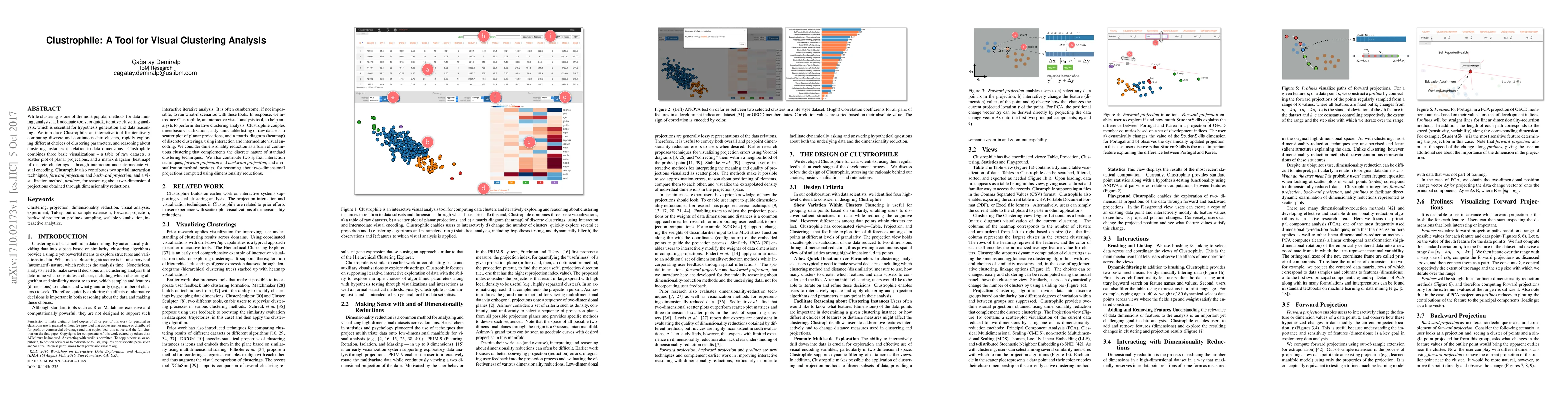 Clustrophile is an interactive tool designed for iterative clustering analysis, enabling analysts to explore various clustering parameters and visualize clusters through a combination of tables, scatter plots, and heatmaps. It introduces forward and backward projection techniques and prolines for reasoning about dimensionality-reduced data.