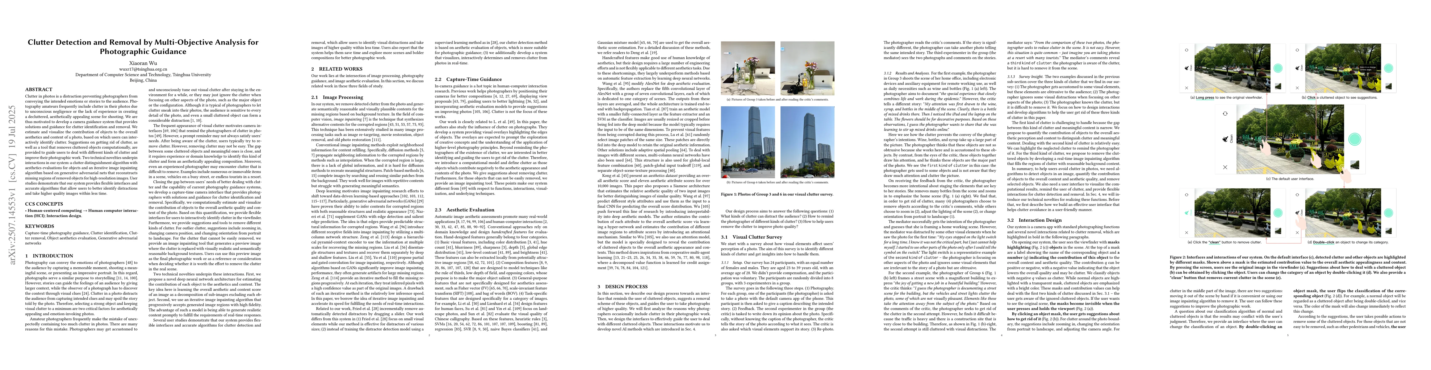 Clutter in photos is a distraction preventing photographers from conveying the intended emotions or stories to the audience. Photography amateurs frequently include clutter in their photos due to unconscious negligence or the lack of experience in creating a decluttered, aesthetically appealing scene for shooting. We are thus motivated to develop a camera guidance system that provides solutions and guidance for clutter identification and removal. We estimate and visualize the contribution of objects to the overall aesthetics and content of a photo, based on which users can interactively identify clutter. Suggestions on getting rid of clutter, as well as a tool that removes cluttered objects computationally, are provided to guide users to deal with different kinds of clutter and improve their photographic work. Two technical novelties underpin interactions in our system: a clutter distinguishment algorithm with aesthetics evaluations for objects and an iterative image inpainting algorithm based on generative adversarial nets that reconstructs missing regions of removed objects for high-resolution images. User studies demonstrate that our system provides flexible interfaces and accurate algorithms that allow users to better identify distractions and take higher quality images within less time.