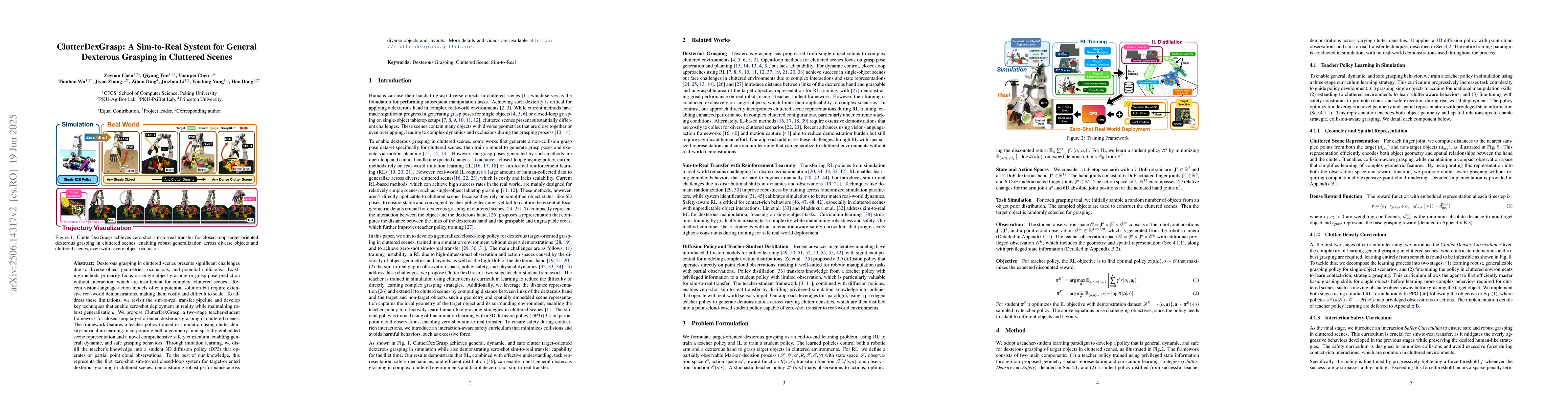 Dexterous grasping in cluttered scenes presents significant challenges due to diverse object geometries, occlusions, and potential collisions. Existing methods primarily focus on single-object grasping or grasp-pose prediction without interaction, which are insufficient for complex, cluttered scenes. Recent vision-language-action models offer a potential solution but require extensive real-world demonstrations, making them costly and difficult to scale. To address these limitations, we revisit the sim-to-real transfer pipeline and develop key techniques that enable zero-shot deployment in reality while maintaining robust generalization. We propose ClutterDexGrasp, a two-stage teacher-student framework for closed-loop target-oriented dexterous grasping in cluttered scenes. The framework features a teacher policy trained in simulation using clutter density curriculum learning, incorporating both a geometry and spatially-embedded scene representation and a novel comprehensive safety curriculum, enabling general, dynamic, and safe grasping behaviors. Through imitation learning, we distill the teacher's knowledge into a student 3D diffusion policy (DP3) that operates on partial point cloud observations. To the best of our knowledge, this represents the first zero-shot sim-to-real closed-loop system for target-oriented dexterous grasping in cluttered scenes, demonstrating robust performance across diverse objects and layouts. More details and videos are available at https://clutterdexgrasp.github.io/.