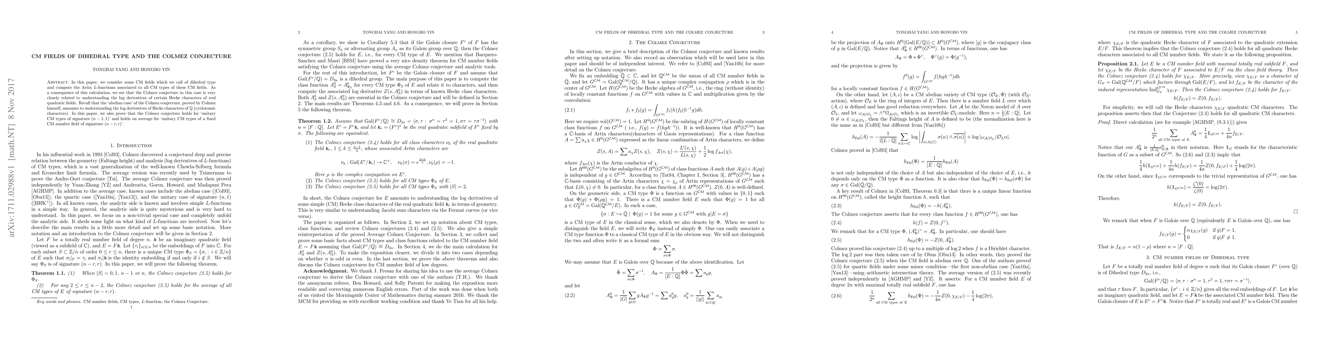 In this paper, we consider some CM fields which we call of dihedral type and compute the Artin $L$-functions associated to all CM types of these CM fields. As a consequence of this calculation, we see that the Colmez conjecture in this case is very closely related to understanding the log derivatives of certain Hecke characters of real quadratic fields. Recall that the `abelian case' of the Colmez conjecture, proved by Colmez himself, amounts to understanding the log derivatives of Hecke characters of $\Q$ (cyclotomic characters). In this paper, we also prove that the Colmez conjecture holds for `unitary CM types of signature $(n-1, 1)$' and holds on average for `unitary CM types of a fixed CM number field of signature $(n-r, r)$'.