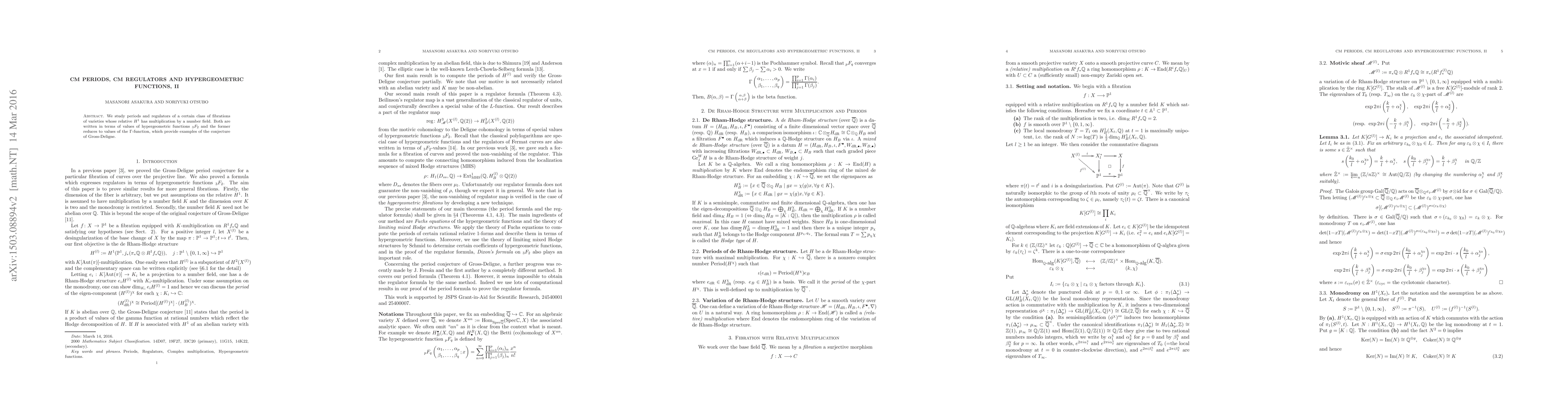 We study periods and regulators of a certain class of fibrations of varieties whose relative $H^1$ has multiplication by a number field. Both are written in terms of values of hypergeometric functions ${}_3F_2$ and the former reduces to values of the gamma function, which provide examples of the conjecture of Gross-Deligne.