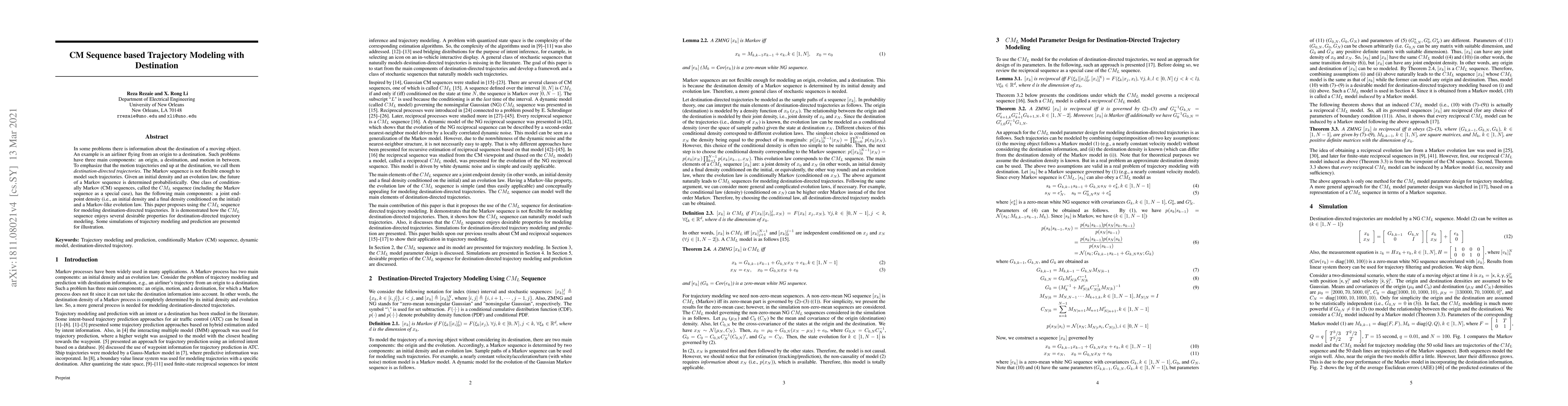 This paper proposes using the CM_L sequence to model destination-directed trajectories, where the motion ends at a specified destination. The CM_L sequence incorporates both initial and final densities, offering a more flexible approach than traditional Markov sequences for trajectory modeling.