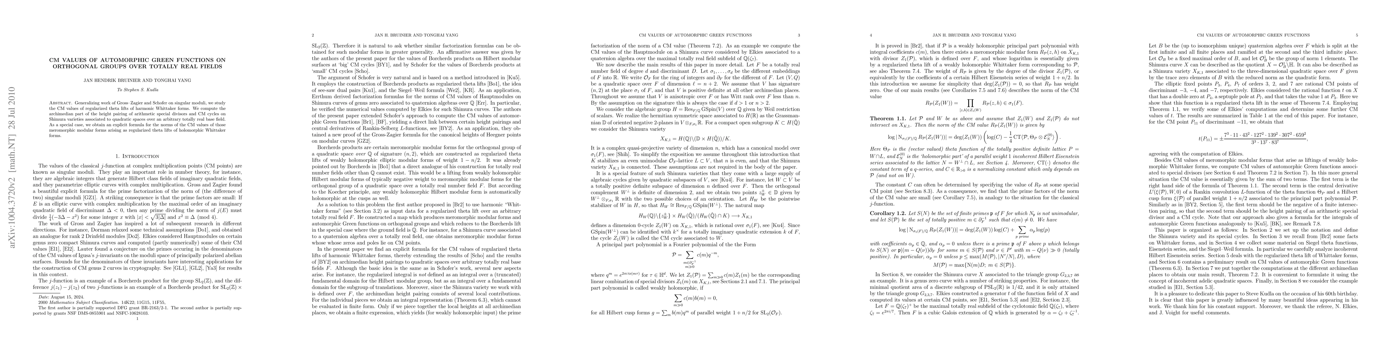 This paper generalizes prior work on singular moduli to compute the CM values of theta lifts of harmonic Whittaker forms, focusing on the archimedian part of the height pairing of special divisors and CM cycles in Shimura varieties over totally real fields. An explicit formula for the norms of CM values of meromorphic modular forms arising as such lifts is derived as a special case.