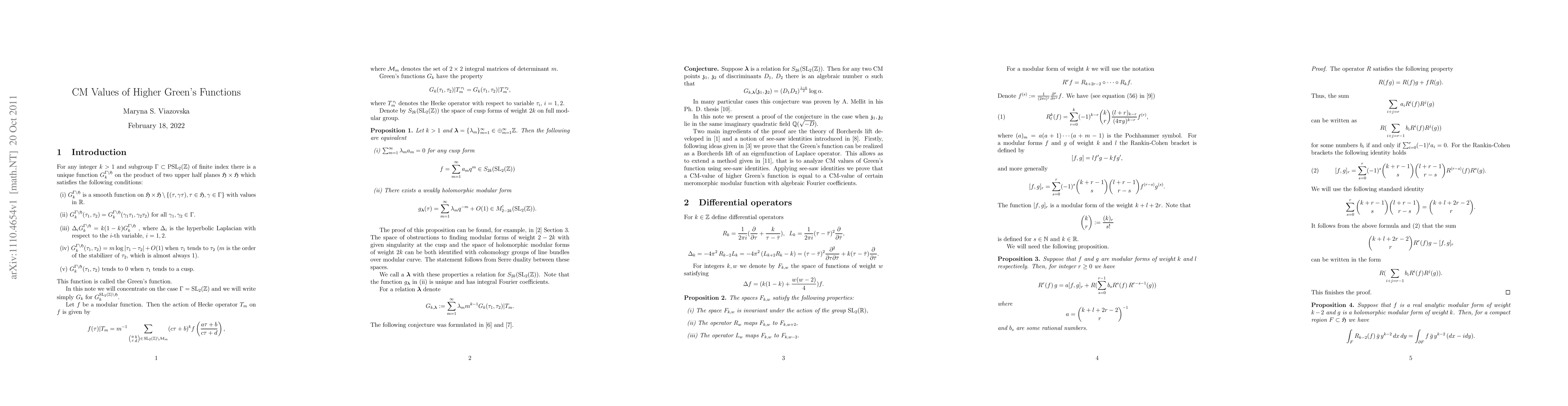 This paper proves the conjecture by Gross and Zagier that higher Green's functions have algebraic values at CM points, specifically for any pair of CM points within the same quadratic imaginary field. The functions are bi-invariant under congruence subgroup actions and satisfy a specific hyperbolic Laplace equation.