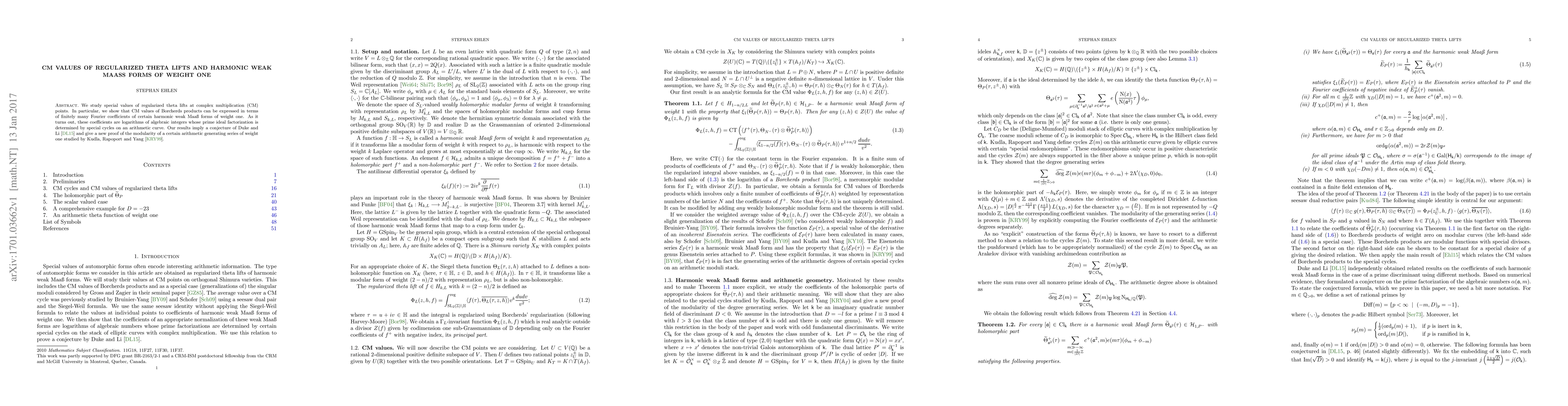 This paper explores special values of regularized theta lifts at complex multiplication points, demonstrating that these values can be represented by finitely many Fourier coefficients of harmonic weak Maass forms of weight one. These coefficients relate to algebraic integers determined by special cycles on an arithmetic curve, supporting a conjecture by Duke and Li and offering a new proof for the modularity of a series studied by Kudla, Rapoport, and Yang.