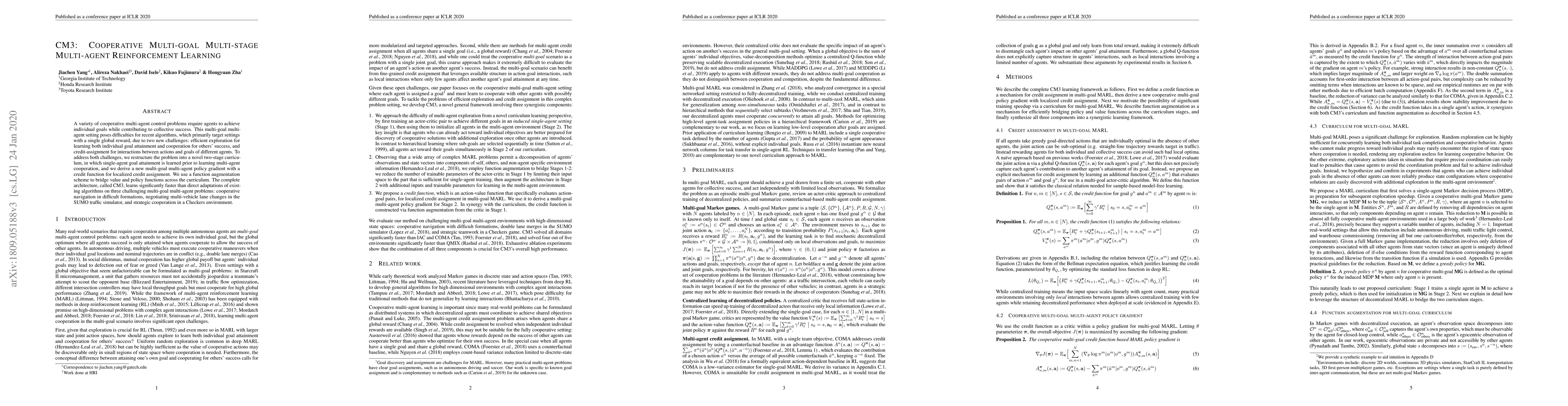 CM3 introduces a novel two-stage curriculum for cooperative multi-goal multi-agent reinforcement learning, addressing the challenges of efficient exploration and credit assignment through a restructured multi-goal policy gradient approach, achieving faster learning in complex cooperative tasks.