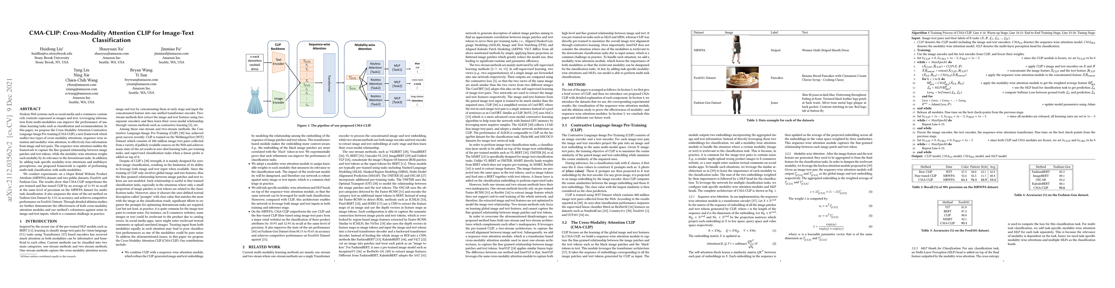 The paper proposes CMA-CLIP, a framework that integrates cross-modality attention to enhance image-text classification by fusing image and text information. Experiments show CMA-CLIP outperforms existing methods on multiple datasets, demonstrating improved recall and accuracy, especially in multi-task settings.