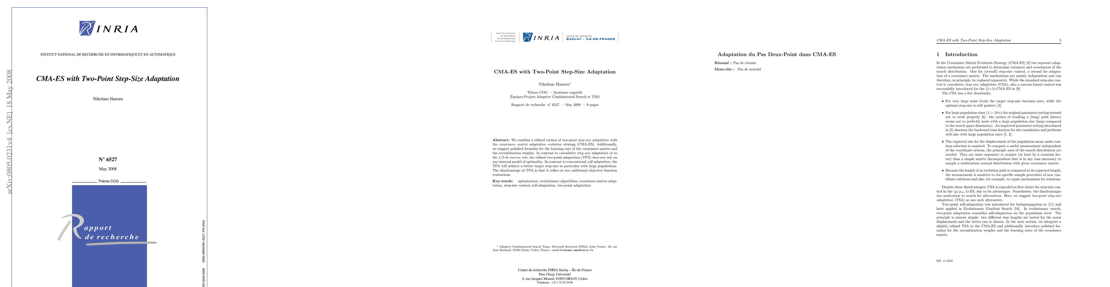 The paper combines a refined version of two-point step-size adaptation with the covariance matrix adaptation evolution strategy (CMA-ES), introducing polished formulae for the learning rate of the covariance matrix and recombination weights.