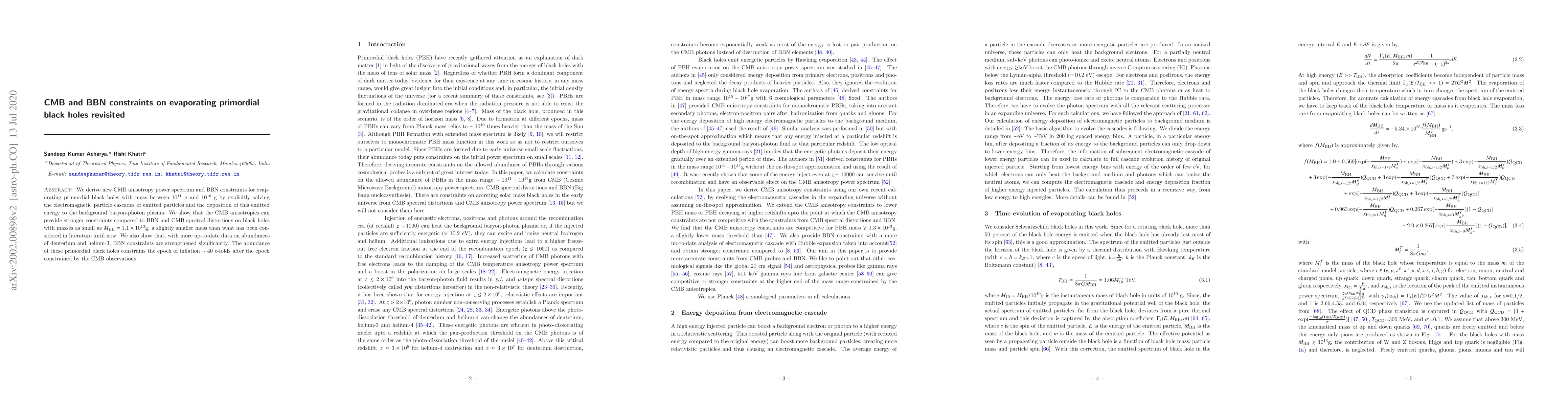 This paper revisits constraints on evaporating primordial black holes (PBHs) using CMB anisotropy and Big Bang Nucleosynthesis (BBN) data, showing that CMB anisotropies provide stronger constraints than BBN for PBHs as small as $M_{\rm BH}=1.1\times 10^{13}$g. Updated BBN data significantly strengthens the BBN constraints.