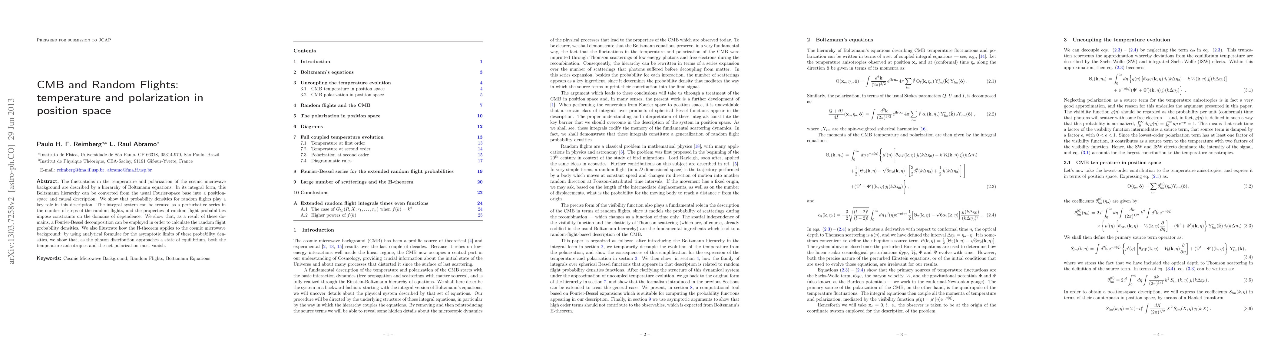 This research paper presents a novel approach to describe fluctuations in the temperature and polarization of the cosmic microwave background (CMB) using a position-space and causal description, rather than the conventional Fourier-space. By converting the Boltzmann hierarchy into this new framework, the authors show that probability densities for random flights are crucial. They demonstrate that these densities can be calculated via a Fourier-Bessel decomposition, and that the H-theorem implies CMB temperature anisotropies and net polarization vanish as the photon distribution reaches equilibrium.