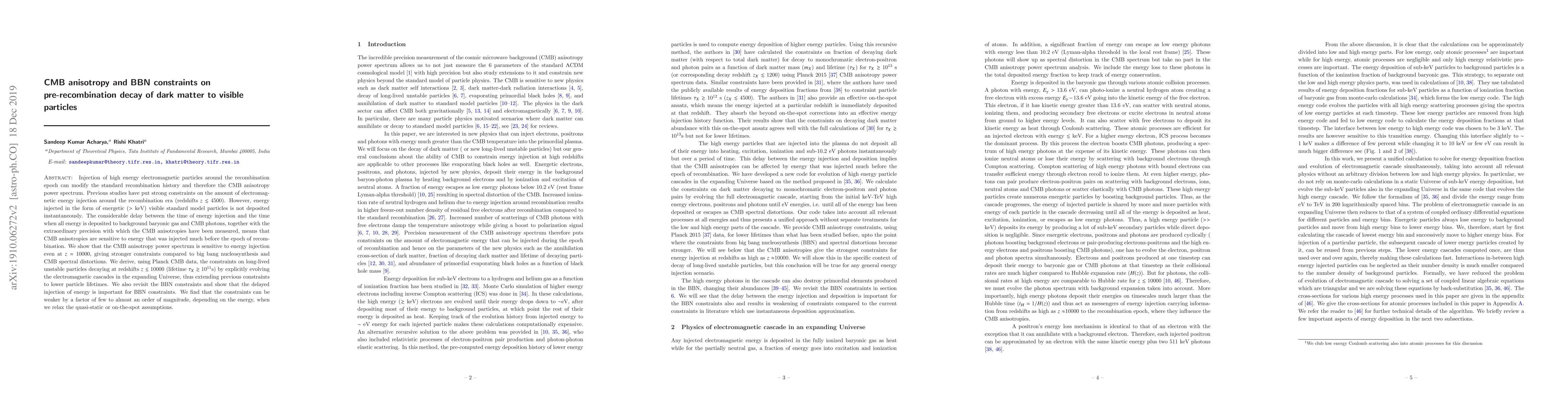 This paper demonstrates that CMB anisotropies are sensitive to energy injection from decaying dark matter particles even at high redshifts ($z = 10000$), providing stronger constraints than big bang nucleosynthesis (BBN). The study derives new limits on the lifetime of long-lived particles decaying before recombination, extending previous constraints, and shows that BBN constraints can be significantly relaxed when considering the delayed energy injection.