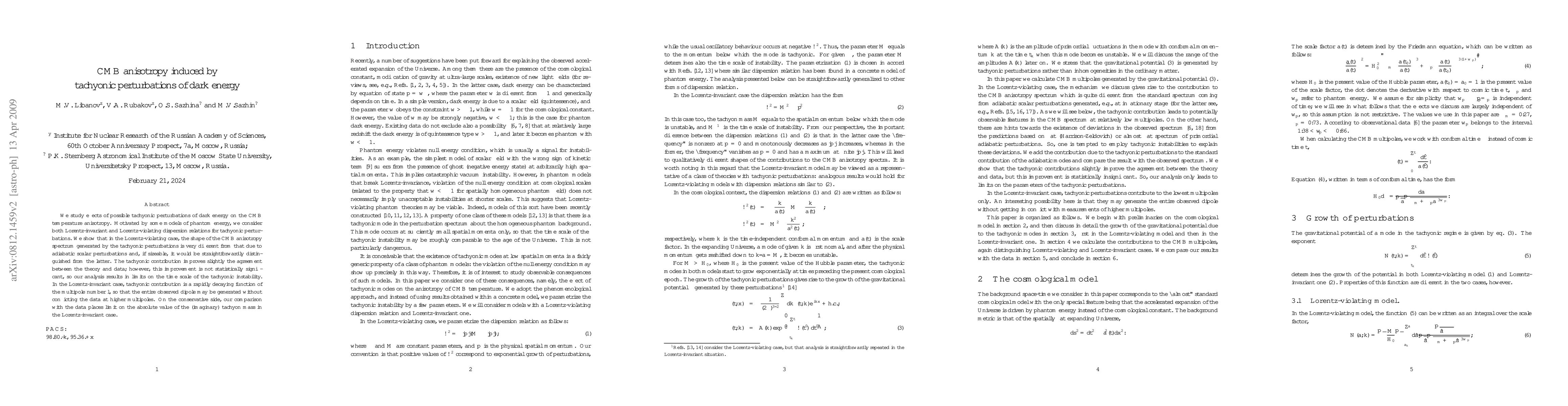 We study effects of possible tachyonic perturbations of dark energy on the CMB temperature anisotropy. Motivated by some models of phantom energy, we consider both Lorentz-invariant and Lorentz-violating dispersion relations for tachyonic perturbations. We show that in the Lorentz-violating case, the shape of the CMB anisotropy spectrum generated by the tachyonic perturbations is very different from that due to adiabatic scalar perturbations and, if sizeable, it would be straightforwardly distinguished from the latter. The tachyonic contribution improves slightly the agreement between the theory and data; however, this improvement is not statistically significant, so our analysis results in limits on the time scale of the tachyonic instability. In the Lorentz-invariant case, tachyonic contribution is a rapidly decaying function of the multipole number $l$, so that the entire observed dipole can be generated without conflicting the data at higher multipoles. On the conservative side, our comparison with the data places limit on the absolute value of the (imaginary) tachyon mass in the Lorentz-invariant case.