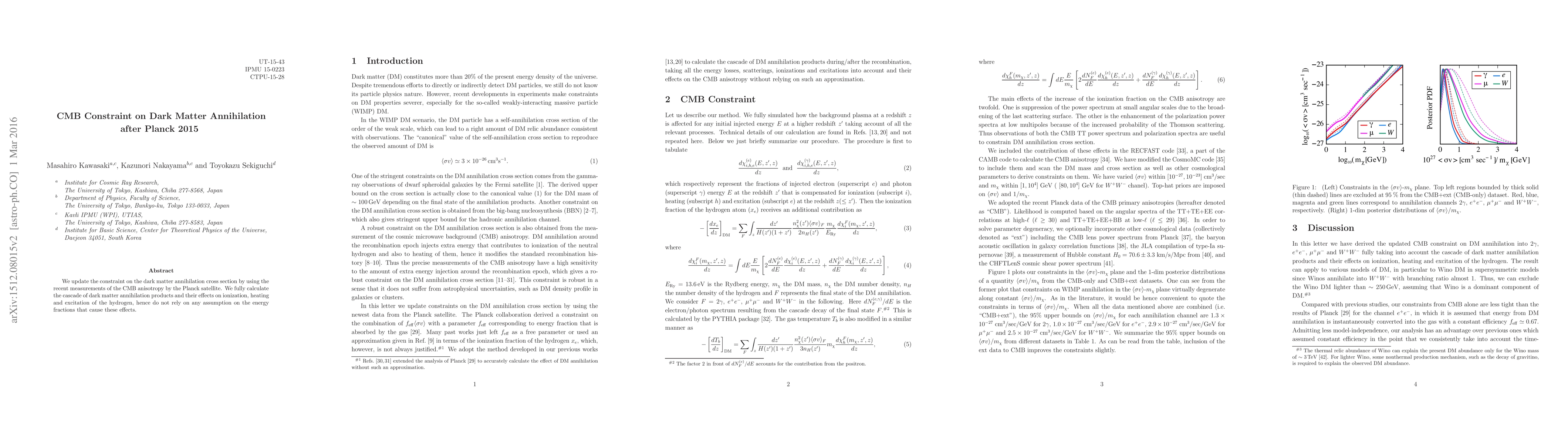 We update the constraint on the dark matter annihilation cross section by using the recent measurements of the CMB anisotropy by the Planck satellite. We fully calculate the cascade of dark matter annihilation products and their effects on ionization, heating and excitation of the hydrogen, hence do not rely on any assumption on the energy fractions that cause these effects.
