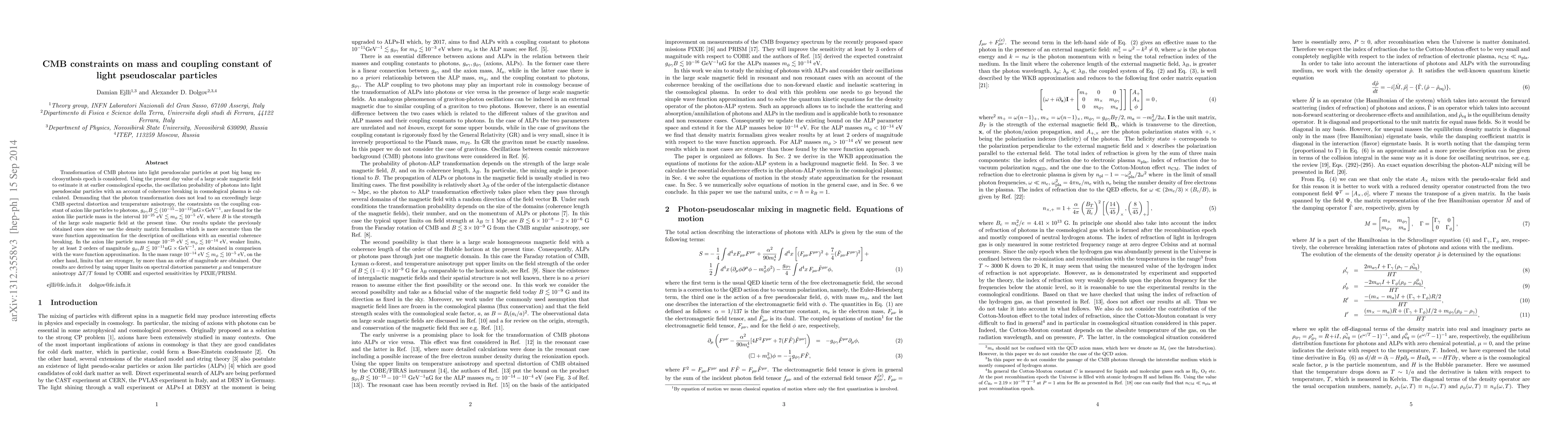 Transformation of CMB photons into light pseudoscalar particles at post big bang nucleosynthesis epoch is considered. Using the present day value of a large scale magnetic field to estimate it at earlier cosmological epochs, the oscillation probability of photons into light pseudoscalar particles with an account of coherence breaking in cosmological plasma is calculated. Demanding that the photon transformation does not lead to an exceedingly large CMB spectral distortion and temperature anisotropy, the constraints on the coupling constant of axion like particles to photons, $ g_{\phi\gamma} B \lesssim (10^{-15} - 10^{-12}) \textrm{nG}\times \textrm{GeV}^{-1}$, are found for the axion like particle mass in the interval $10^{-25}$ eV $\lesssim m_{\phi}\lesssim 10^{-5}$ eV, where $B$ is the strength of the large scale magnetic field at the present time. Our results update the previously obtained ones since we use the density matrix formalism which is more accurate than the wave function approximation for the description of oscillations with an essential coherence breaking. In the axion like particle mass range $10^{-25}$ eV $\lesssim m_{\phi}\lesssim 10^{-14}$ eV, weaker limits, by at least 2 orders of magnitude $g_{\phi\gamma} B \lesssim 10^{-11}\textrm{nG}\times \textrm{GeV}^{-1}$, are obtained in comparison with the wave function approximation. In the mass range $10^{-14}$ eV $\lesssim m_{\phi}\lesssim 10^{-5}$ eV, on the other hand, limits that are stronger, by more than an order of magnitude are obtained. Our results are derived by using upper limits on spectral distortion parameter $\mu$ and temperature anisotropy $\Delta T/T$ found by COBE and expected sensitivities by PIXIE/PRISM.