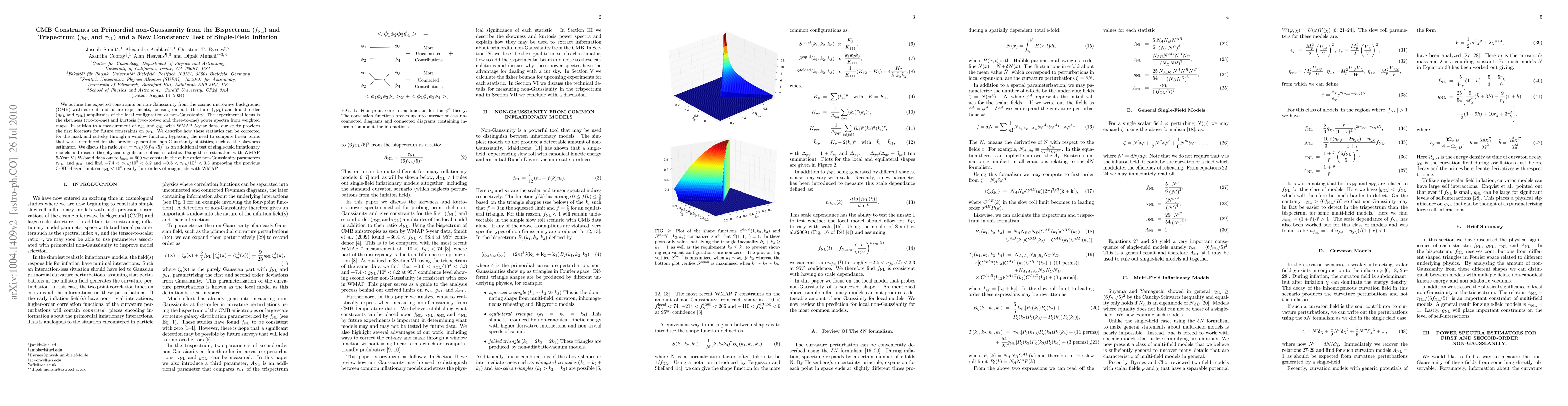 This paper presents constraints on primordial non-Gaussianity from the cosmic microwave background (CMB) using the bispectrum and trispectrum, focusing on the parameters f_{NL}, g_{NL}, and \tau_{NL}. It forecasts future experimental limits and introduces a new consistency test for single-field inflation models using the ratio A_{NL}.