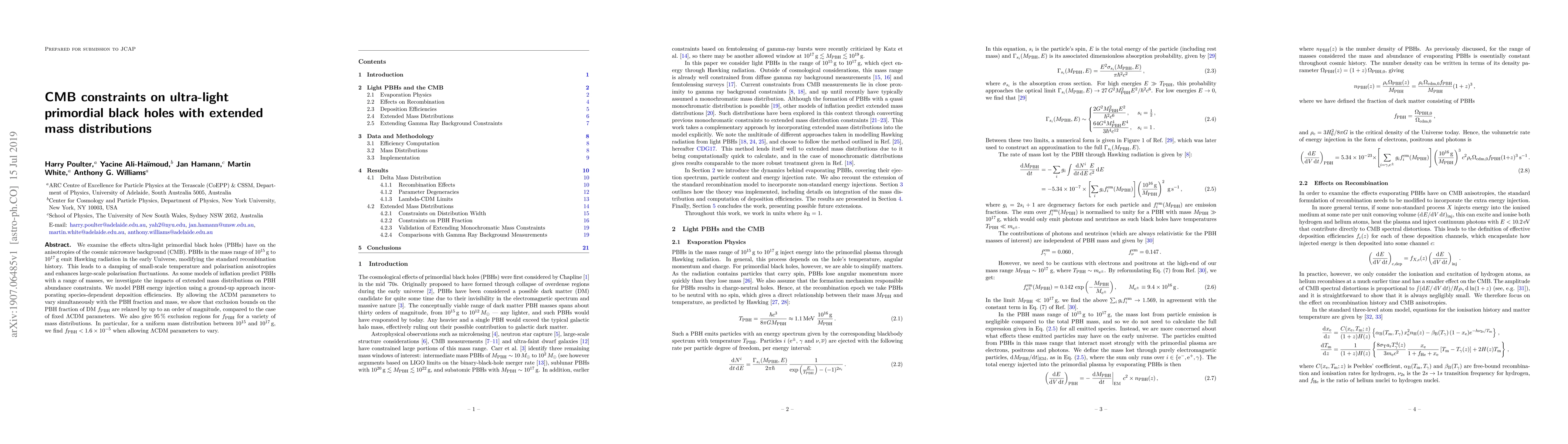 We examine the effects ultra-light primordial black holes (PBHs) have on the anisotropies of the cosmic microwave background (CMB). PBHs in the mass range of $10^{15}$ to $10^{17}$ g emit Hawking radiation in the early Universe, modifying the standard recombination history. This leads to a damping of small-scale temperature and polarisation anisotropies and enhances large-scale polarisation fluctuations. As some models of inflation predict PBHs with a range of masses, we investigate the impacts of extended mass distributions on PBH abundance constraints. We model PBH energy injection using a ground-up approach incorporating species-dependent deposition efficiencies. By allowing the $\Lambda$CDM parameters to vary simultaneously with the PBH fraction and mass, we show that exclusion bounds on the PBH fraction of DM $f_\text{PBH}$ are relaxed by up to an order of magnitude, compared to the case of fixed $\Lambda$CDM parameters. We also give 95% exclusion regions for $f_\text{PBH}$ for a variety of mass distributions. In particular, for a uniform mass distribution between $10^{15}$ and $10^{17}$ g, we find $f_\text{PBH} < 1.6 \times 10^{-5}$ when allowing $\Lambda$CDM parameters to vary.