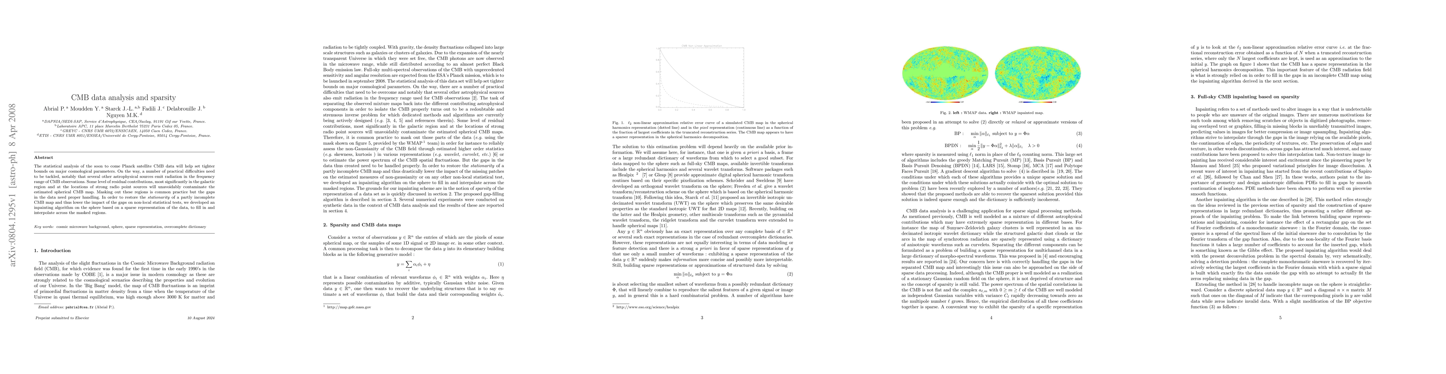 The paper discusses challenges in analyzing Planck satellite CMB data, focusing on contamination from astrophysical sources and the gaps left by masking these regions. It introduces an inpainting algorithm based on sparse data representation to restore the stationarity of the CMB map and mitigate the impact of these gaps.
