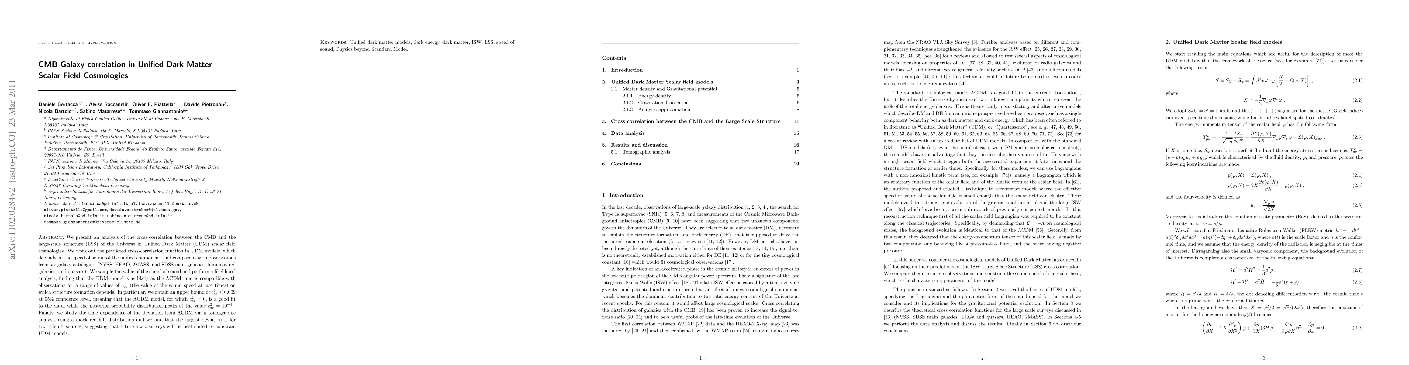 This paper analyzes the cross-correlation between the Cosmic Microwave Background (CMB) and large-scale structure (LSS) in Unified Dark Matter scalar field cosmologies, comparing predictions with galaxy catalogues. The study finds that the UDM model is as likely as the LambdaCDM model and provides an upper bound of c_\infinity^2 ≤ 0.009 at 95% confidence level, suggesting future low-redshift surveys could better constrain UDM models.