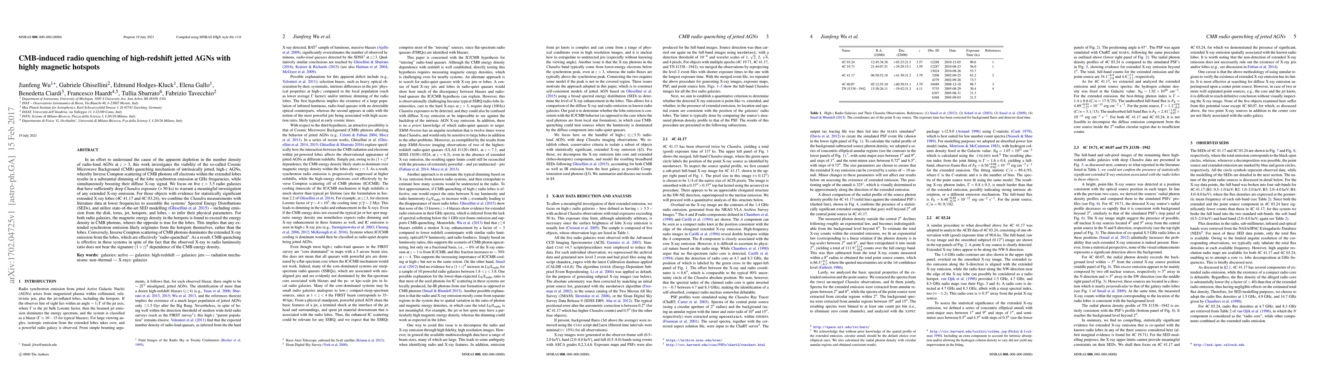 In an effort to understand the cause of the apparent depletion in the number density of radio-loud AGNs at $z>3$, this work investigates the viability of the so-called Cosmic Microwave Background (CMB) quenching mechanism of intrinsically jetted, high-z AGNs, whereby Inverse Compton scattering of CMB photons off electrons within the extended lobes results in a substantial dimming of the lobe synchrotron emission at GHz frequencies, while simultaneously boosting their diffuse X-ray signal. We focus on five $z>3.5$ radio galaxies that have sufficiently deep Chandra exposure (> 50 ks) to warrant a meaningful investigation of any extended X-ray emission. For those objects with evidence for statistically significant extended X-ray lobes (4C 41.17 and 4C 03.24), we combine the Chandra measurements with literature data at lower frequencies to assemble the systems' Spectral Energy Distributions (SEDs), and utilize state-of-the-art SED modelling (Ghisellini et al. 2015) -- including emission from the disk, torus, jet, hotspots, and lobes -- to infer their physical parameters. For both radio galaxies, the magnetic energy density in the hotspots is found to exceed the energy density in CMB photons, wheres the opposite is true for the lobes. This implies that any extended synchrotron emission likely originates from the hotspots themselves, rather than the lobes. Conversely, Inverse Compton scattering of CMB photons dominates the extended X-ray emission from the lobes, which are effectively "radio-quenched". As a result, CMB quenching is effective in these systems in spite of the fact that the observed X-ray to radio luminosity ratio does not bear the signature $(1+z)^4$ dependence of the CMB energy density.