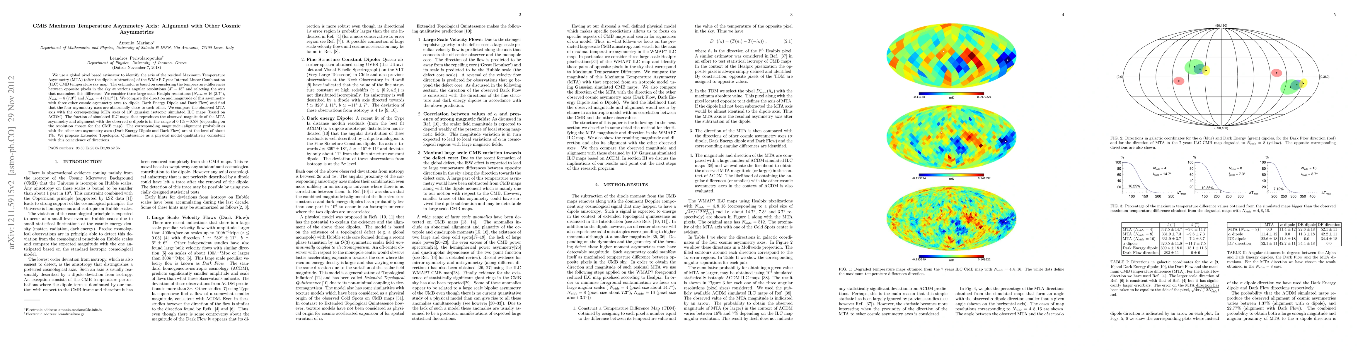 We use a global pixel based estimator to identify the axis of the residual Maximum Temperature Asymmetry (MTA) (after the dipole subtraction) of the WMAP 7 year Internal Linear Combination (ILC) CMB temperature sky map. The estimator is based on considering the temperature differences between opposite pixels in the sky at various angular resolutions (4 degrees-15 degrees and selecting the axis that maximizes this difference. We consider three large scale Healpix resolutions (N_{side}=16 (3.7 degrees), N_{side}=8 (7.3 degrees) and N_{side}=4 (14.7 degrees)). We compare the direction and magnitude of this asymmetry with three other cosmic asymmetry axes (\alpha dipole, Dark Energy Dipole and Dark Flow) and find that the four asymmetry axes are abnormally close to each other. We compare the observed MTA axis with the corresponding MTA axes of 10^4 Gaussian isotropic simulated ILC maps (based on LCDM). The fraction of simulated ILC maps that reproduces the observed magnitude of the MTA asymmetry and alignment with the observed \alpha dipole is in the range of 0.1%-0.5%$ (depending on the resolution chosen for the CMB map). The corresponding magnitude+alignment probabilities with the other two asymmetry axes (Dark Energy Dipole and Dark Flow) are at the level of about 1%. We propose Extended Topological Quintessence as a physical model qualitatively consistent with this coincidence of directions.
