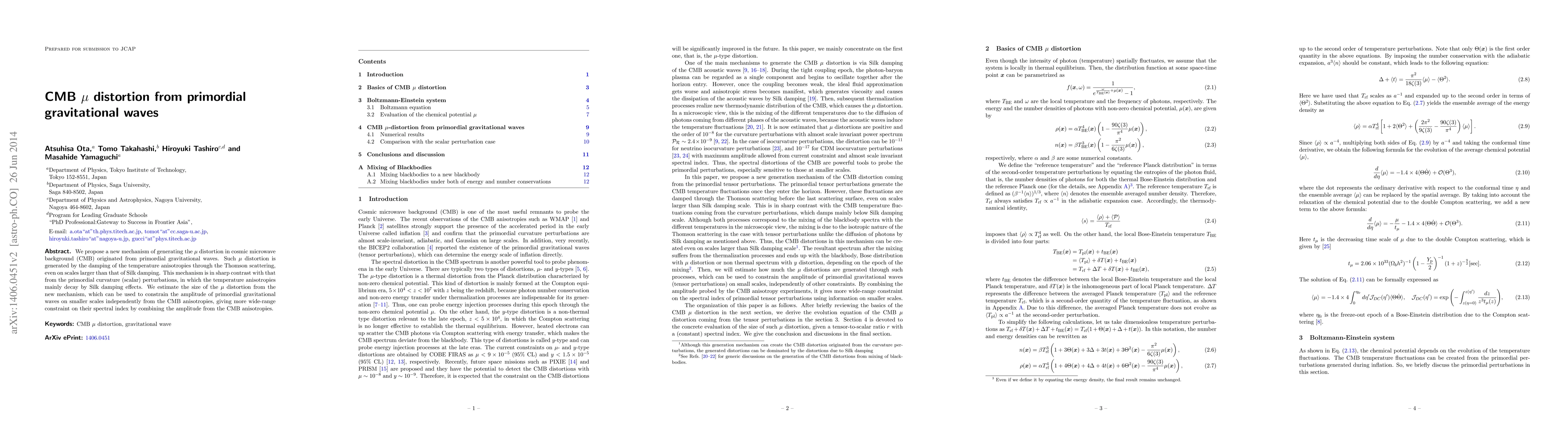 This paper proposes a novel mechanism for generating $\mu$ distortion in the cosmic microwave background (CMB) via primordial gravitational waves, contrasting with the traditional decay by Silk damping from scalar perturbations. The study estimates the size of this distortion to independently constrain the amplitude of primordial gravitational waves and their spectral index.
