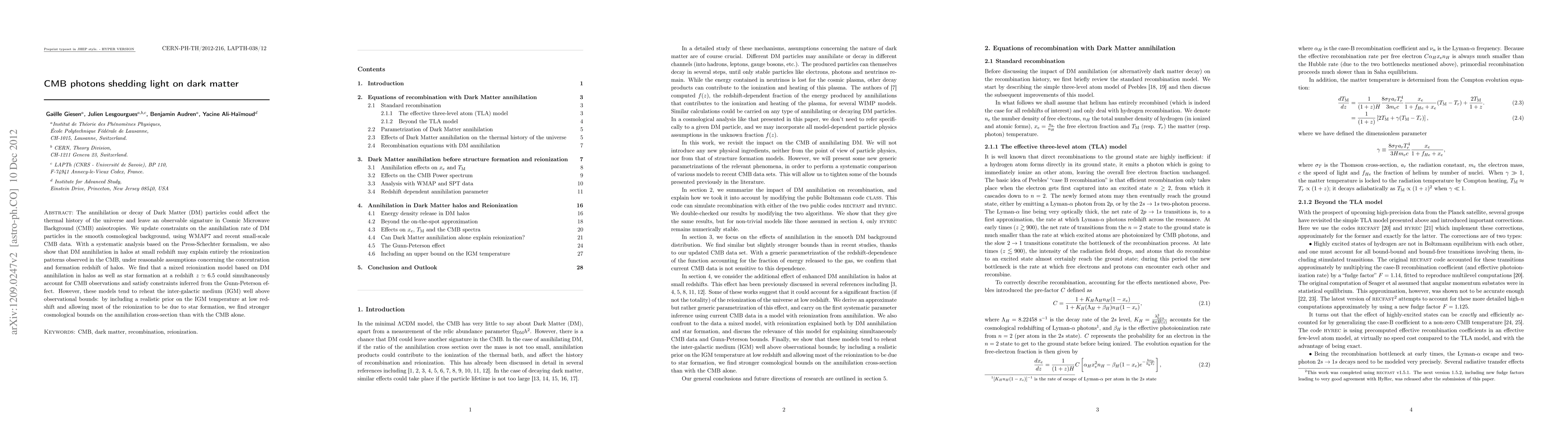 The annihilation or decay of Dark Matter (DM) particles could affect the thermal history of the universe and leave an observable signature in Cosmic Microwave Background (CMB) anisotropies. We update constraints on the annihilation rate of DM particles in the smooth cosmological background, using WMAP7 and recent small-scale CMB data. With a systematic analysis based on the Press-Schechter formalism, we also show that DM annihilation in halos at small redshift may explain entirely the reionization patterns observed in the CMB, under reasonable assumptions concerning the concentration and formation redshift of halos. We find that a mixed reionization model based on DM annihilation in halos as well as star formation at a redshift z~6.5 could simultaneously account for CMB observations and satisfy constraints inferred from the Gunn-Peterson effect. However, these models tend to reheat the inter-galactic medium (IGM) well above observational bounds: by including a realistic prior on the IGM temperature at low redshift, we find stronger cosmological bounds on the annihilation cross-section than with the CMB alone.